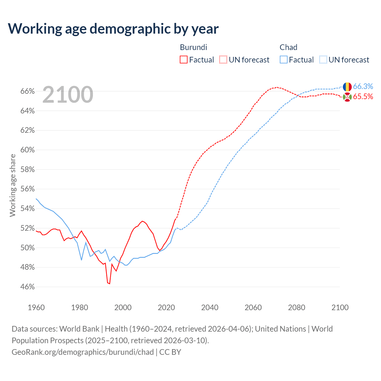 Median age Burundi vs Chad, 1960-2100