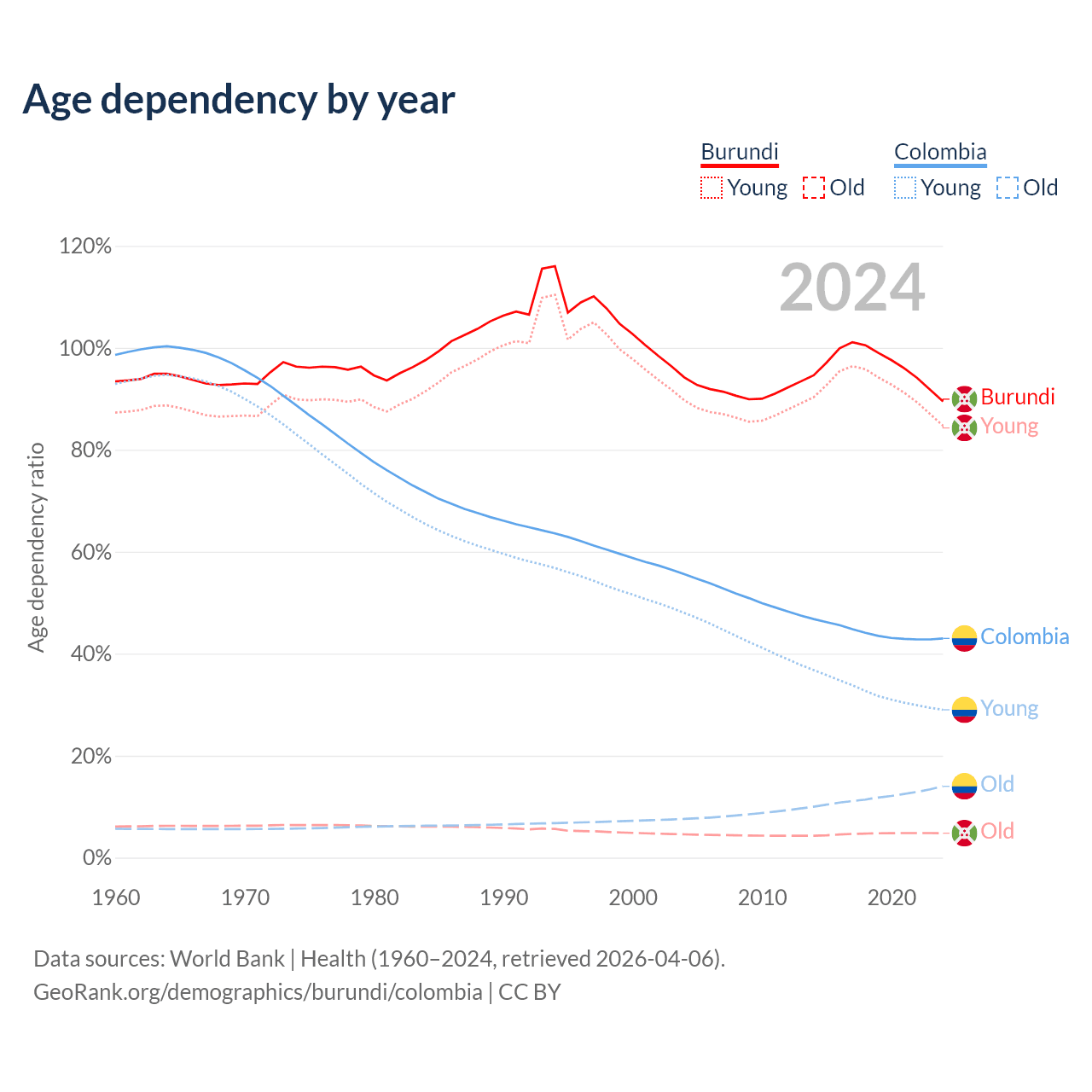 - Burundi is ranked 190/196 by median age (oldest to youngest) vs 89/196 for Colombia.