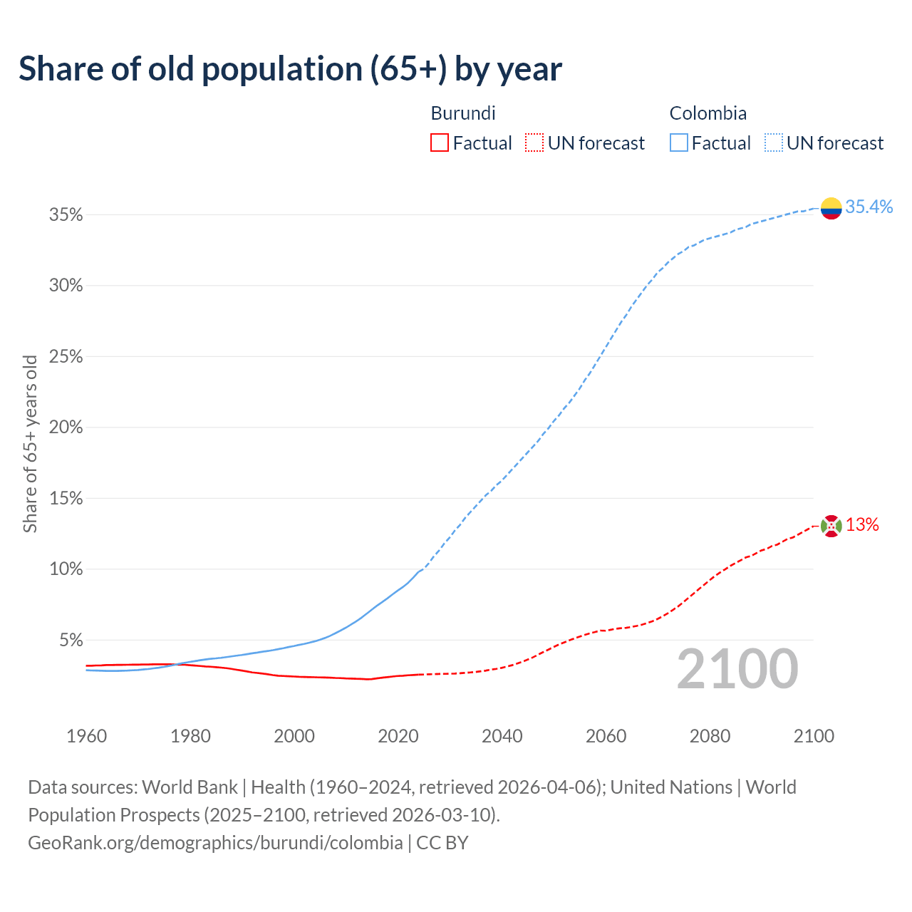 - The share of old-age demographic (65+) in Burundi is 2.53% vs 9.78% in Colombia.