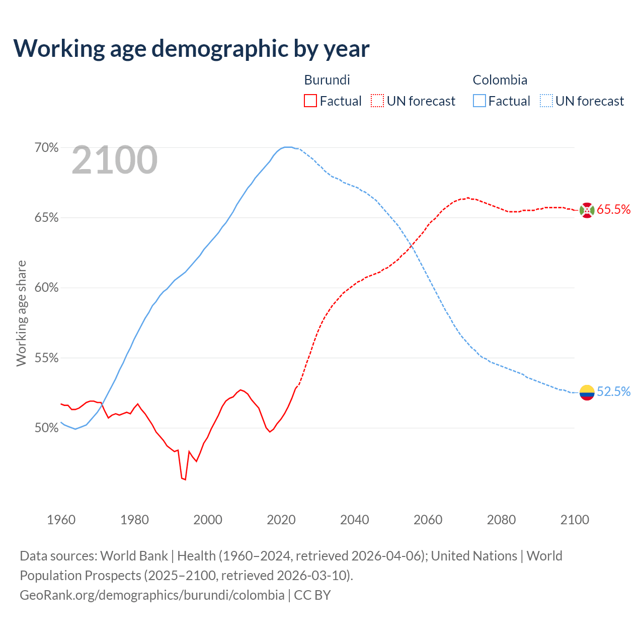Median age Burundi vs Colombia, 1960-2100