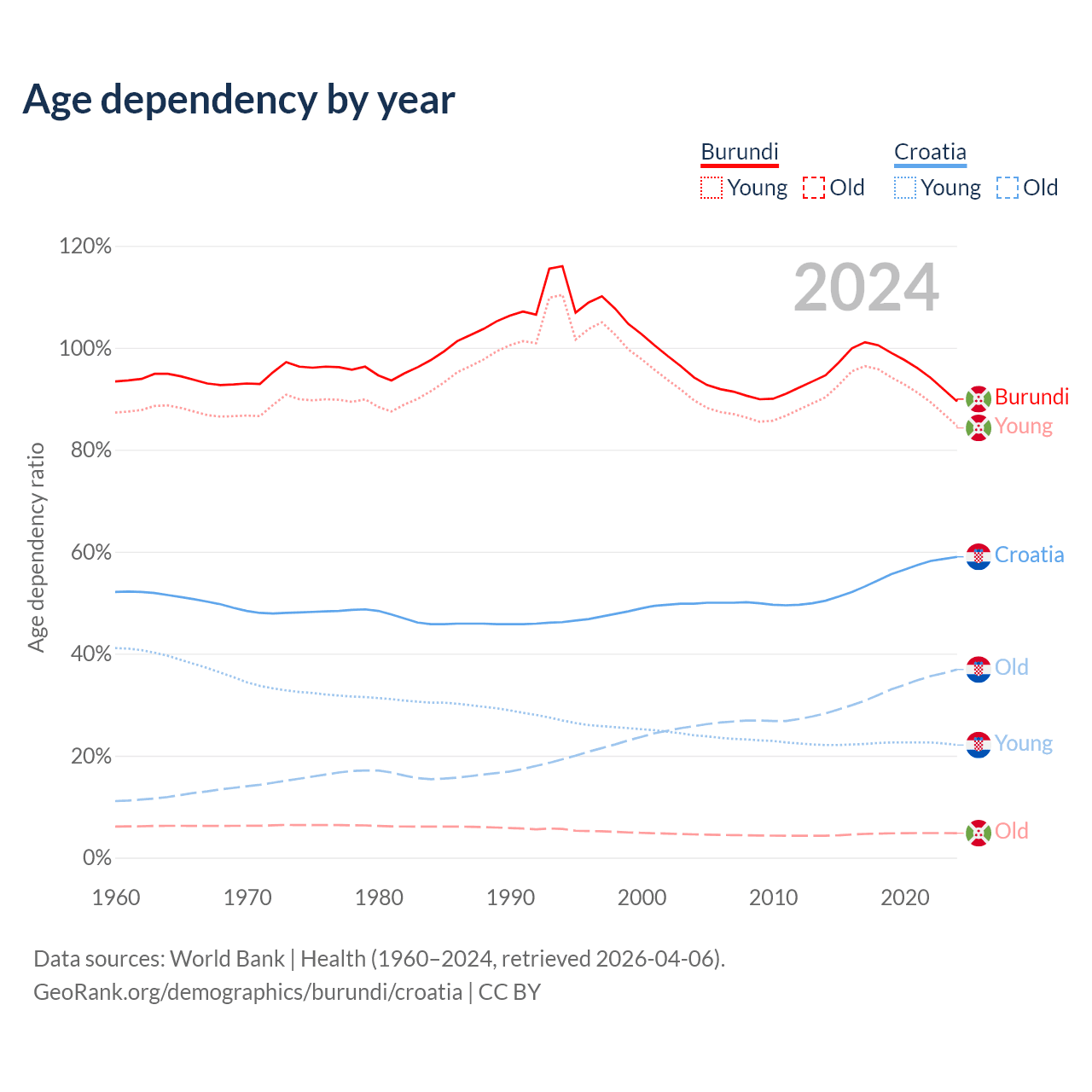 - Burundi is ranked 190/196 by median age (oldest to youngest) vs 11/196 for Croatia.