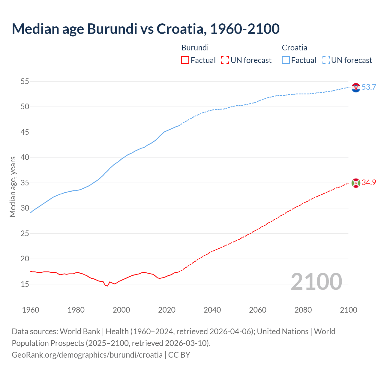 Median age Burundi vs Croatia, 1960-2100