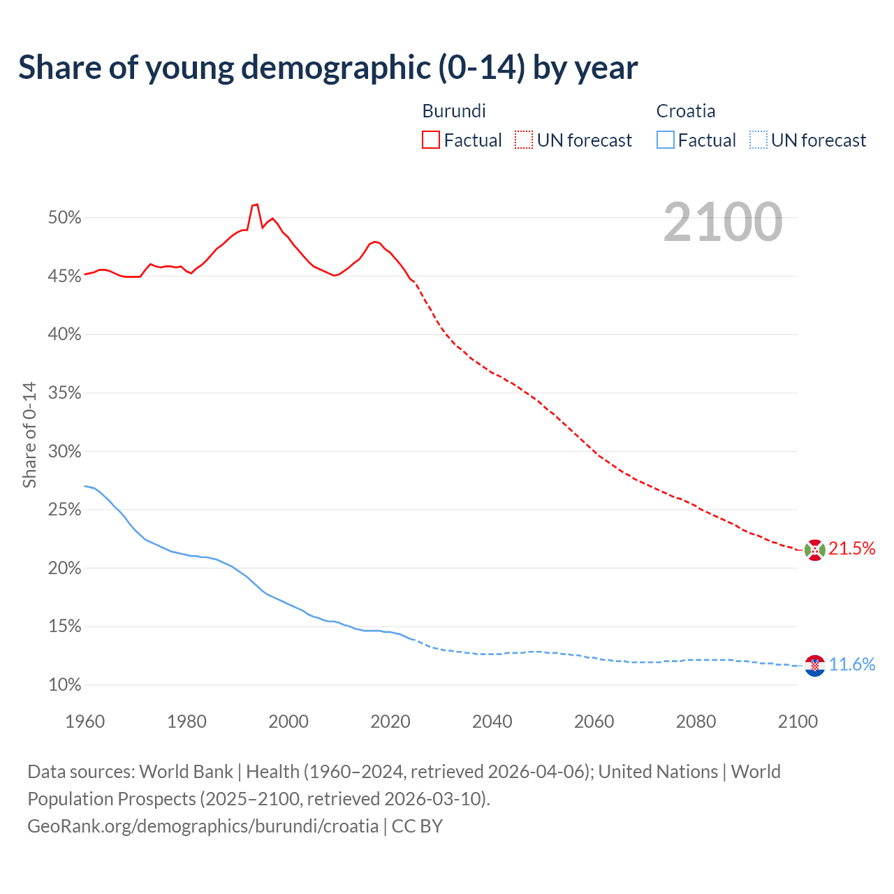 - The share of young demographic (0-15 years old) in Burundi is 44.7% vs 13.9% in Croatia.