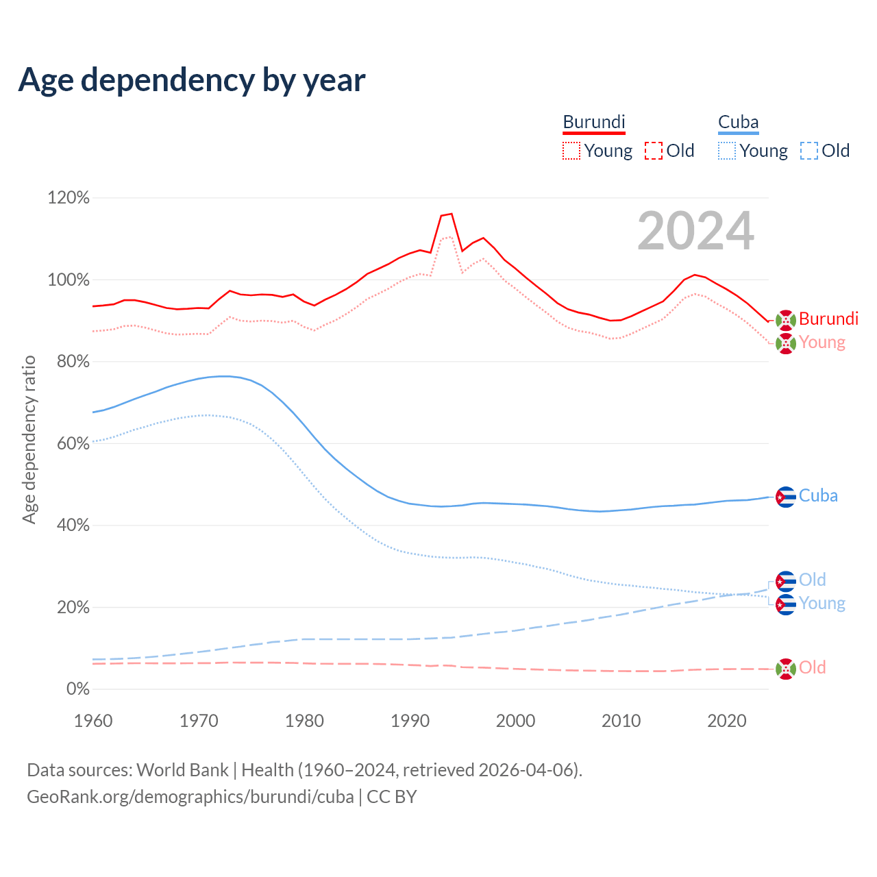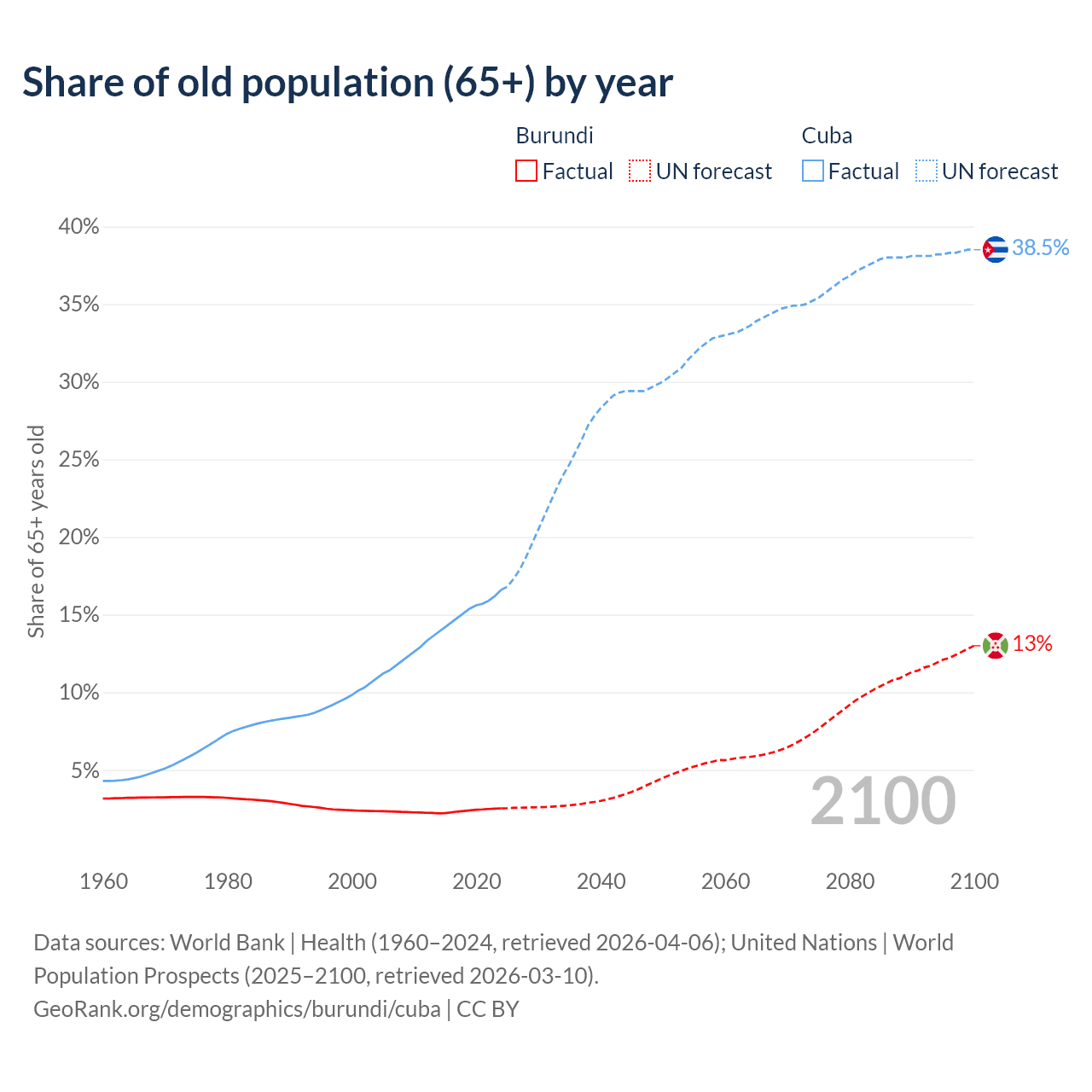 - The share of old-age demographic (65+) in Burundi is 2.53% vs 16.6% in Cuba.