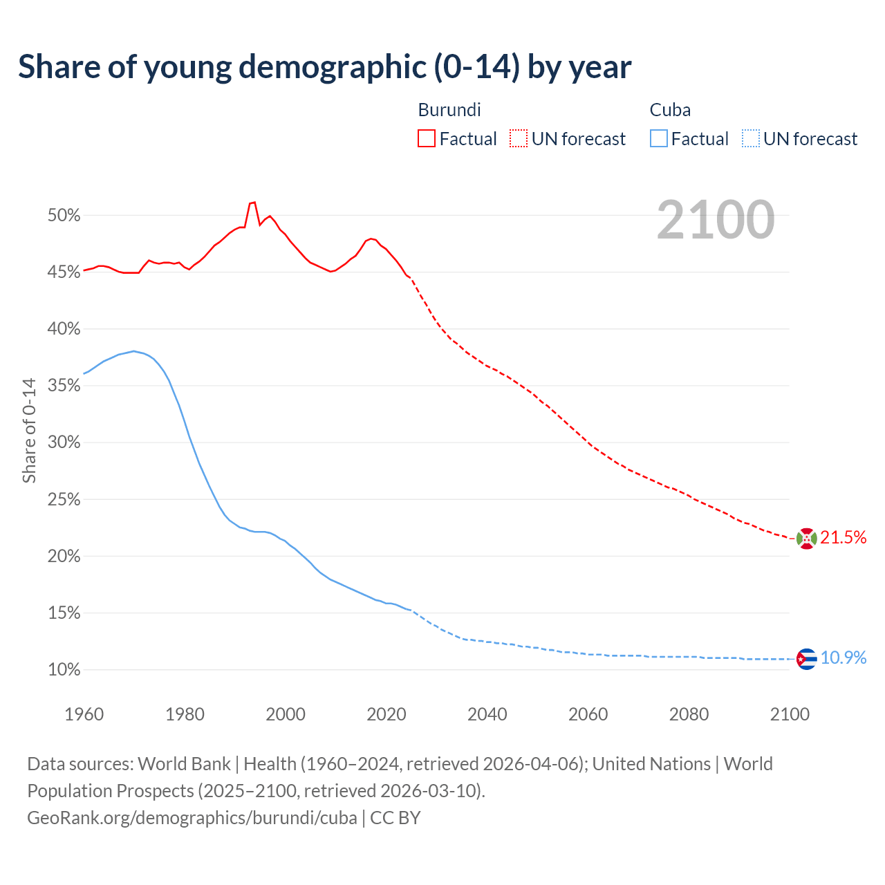 - The share of young demographic (0-15 years old) in Burundi is 44.7% vs 15.3% in Cuba.