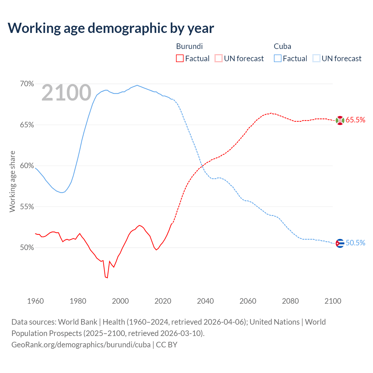 - Burundi has 7.83M working age adults (aged 15-64) vs 7.42M in Cuba.