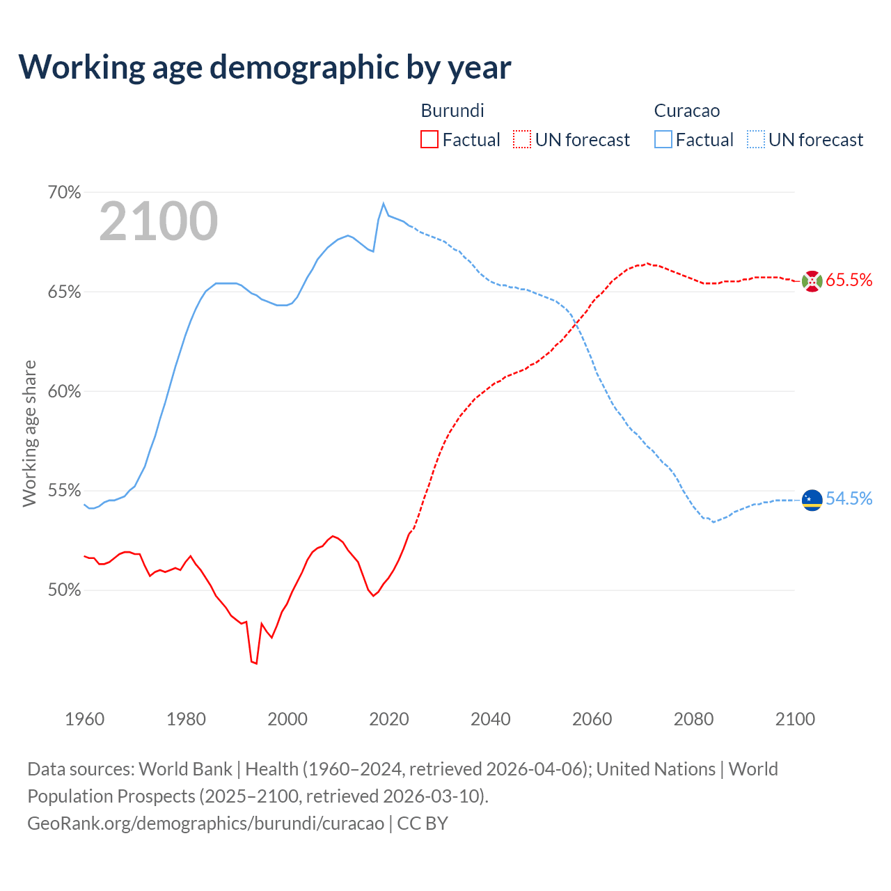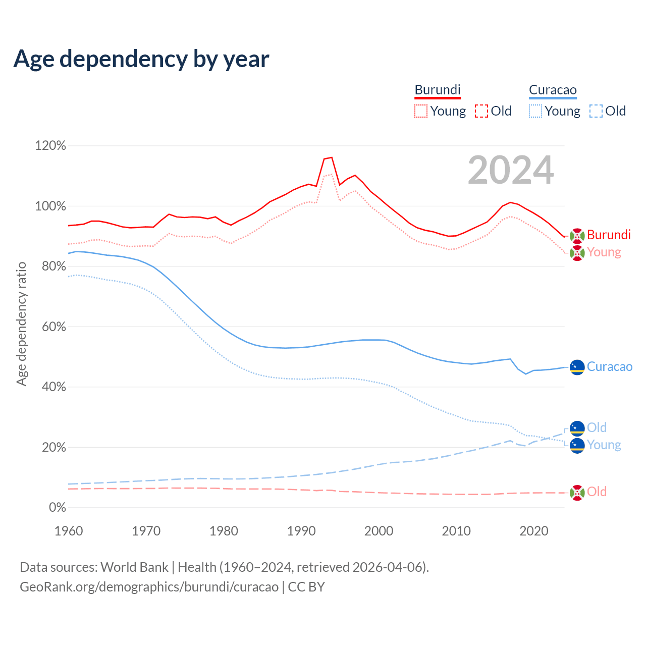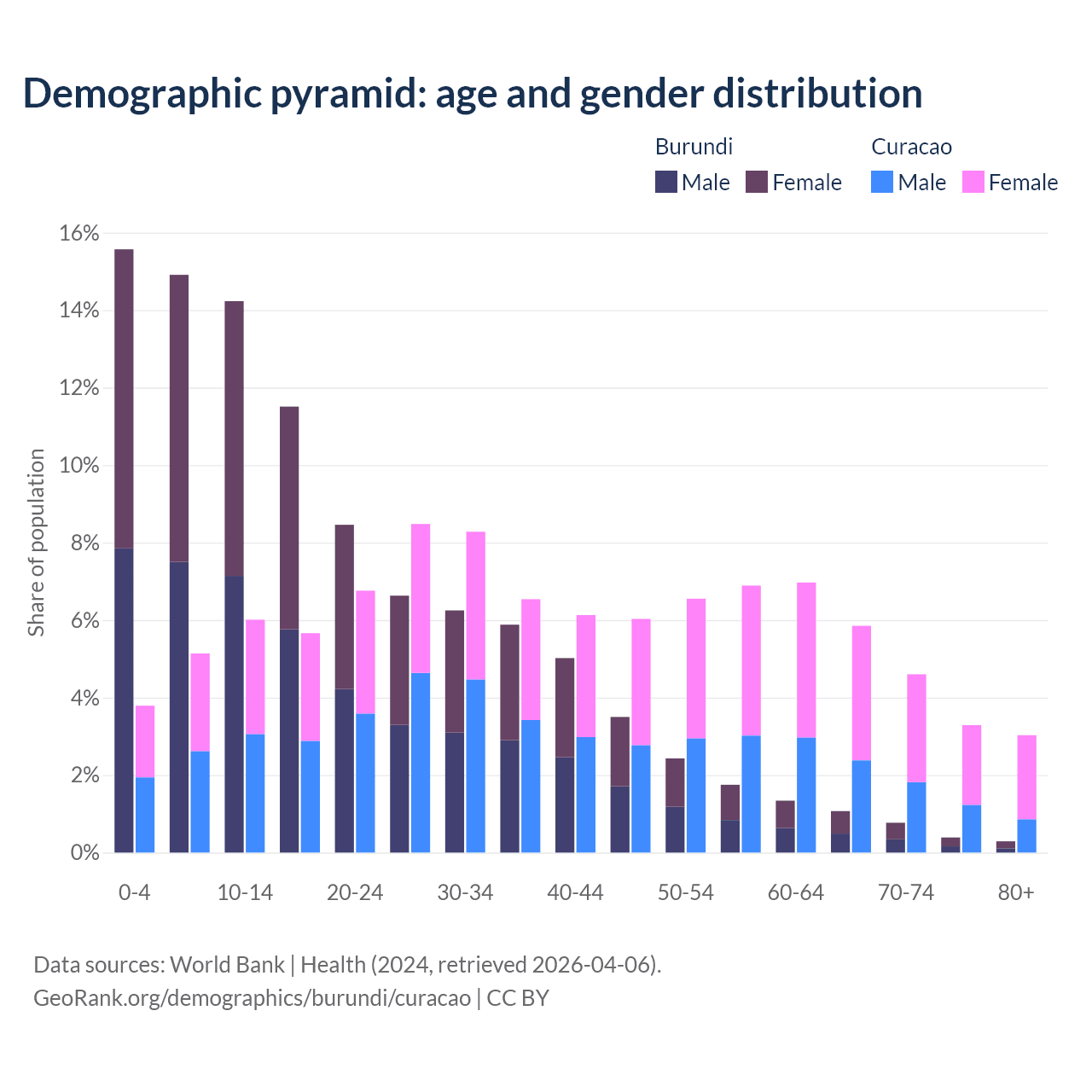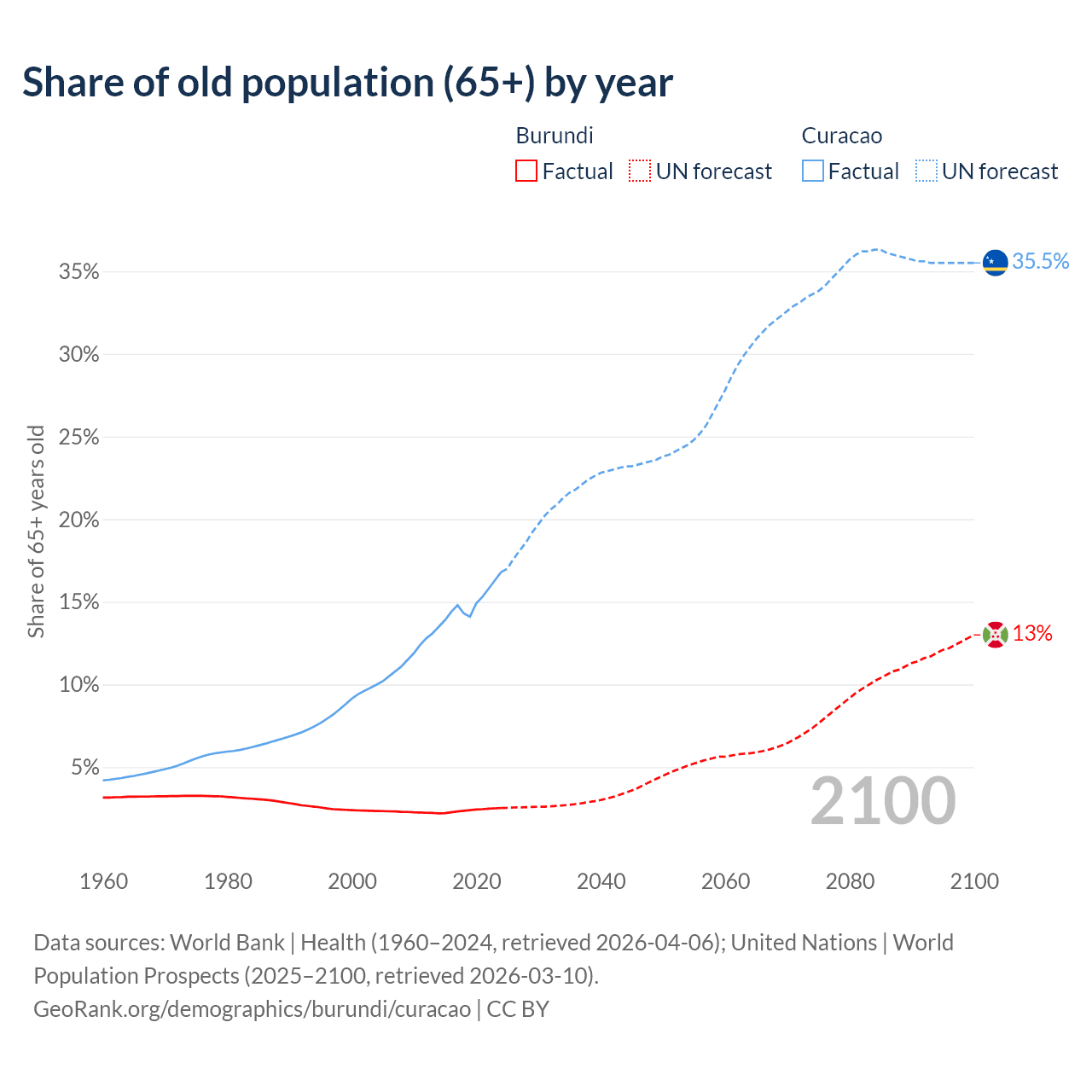 - The share of old-age demographic (65+) in Burundi is 2.53% vs 16.8% in Curacao.