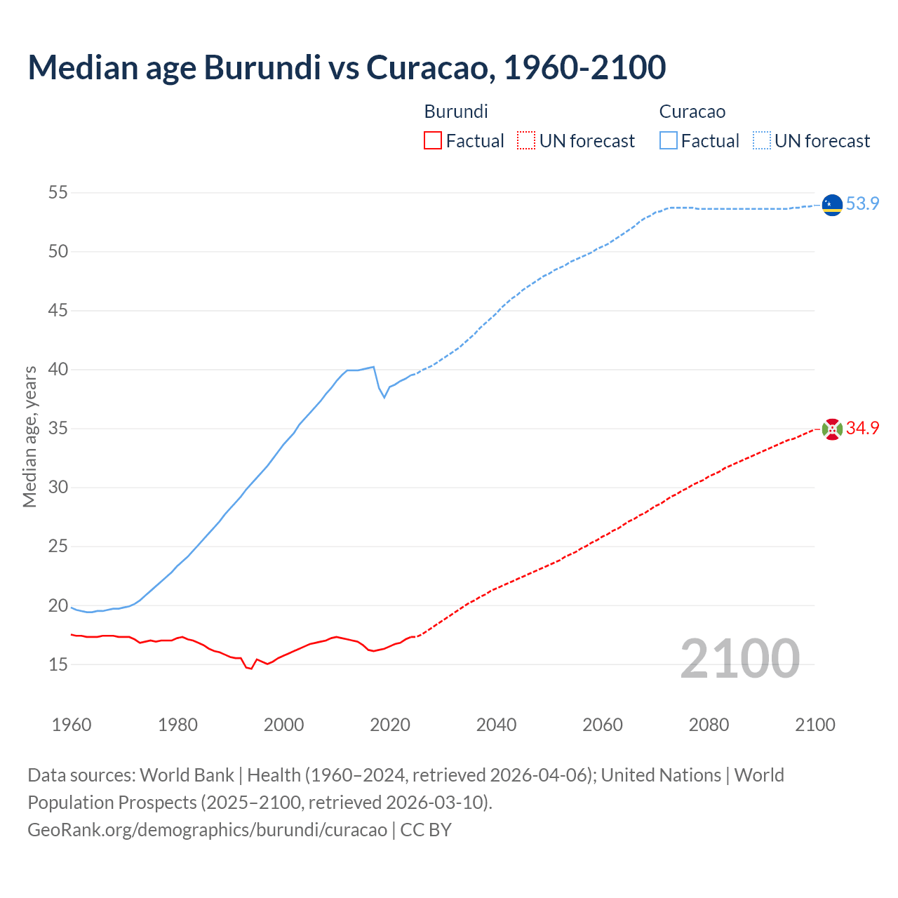 - Burundi is ranked 190/196 by median age (oldest to youngest) vs 49/196 for Curacao.
