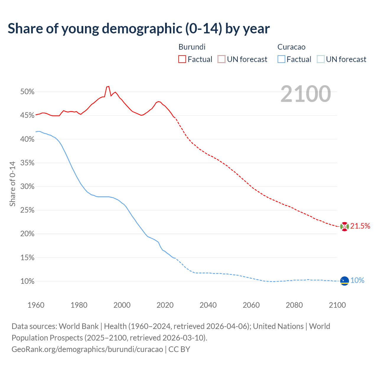 - The share of young demographic (0-15 years old) in Burundi is 44.7% vs 14.9% in Curacao.