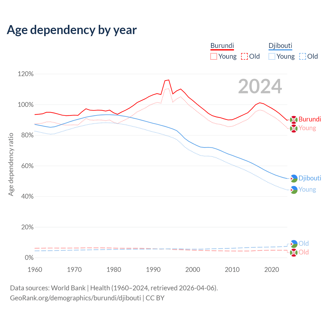 - Burundi is ranked 190/196 by median age (oldest to youngest) vs 129/196 for Djibouti.
