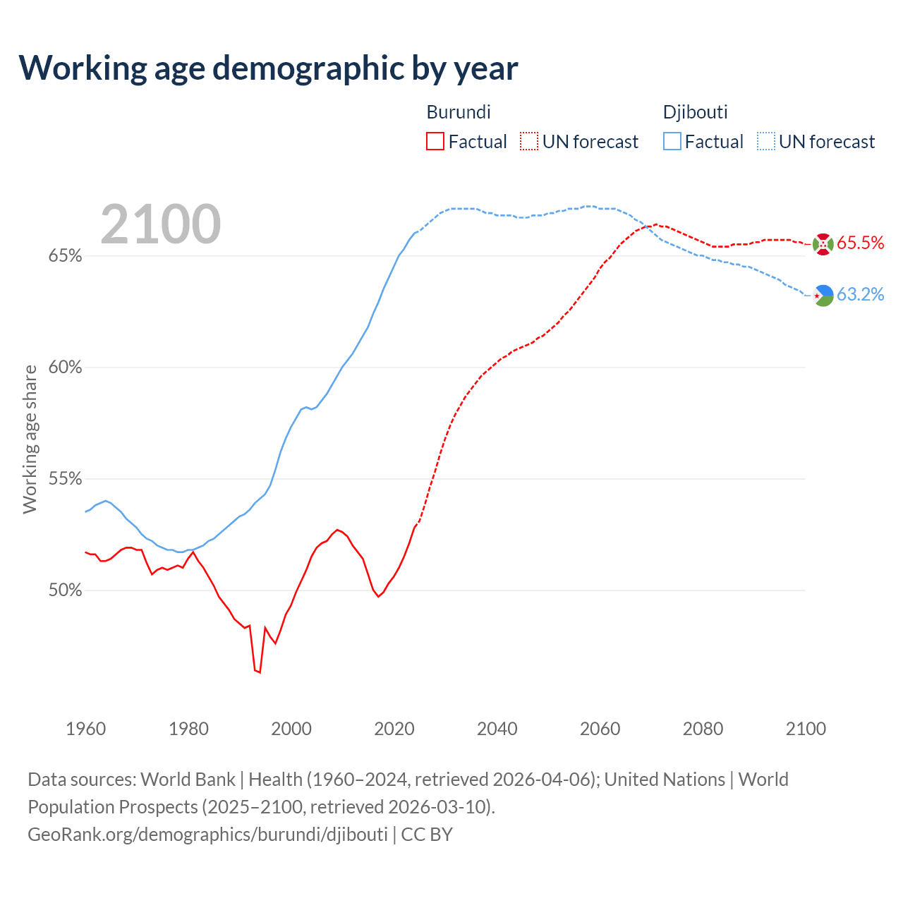 - Burundi has 7.83M working age adults (aged 15-64) vs 794K in Djibouti.