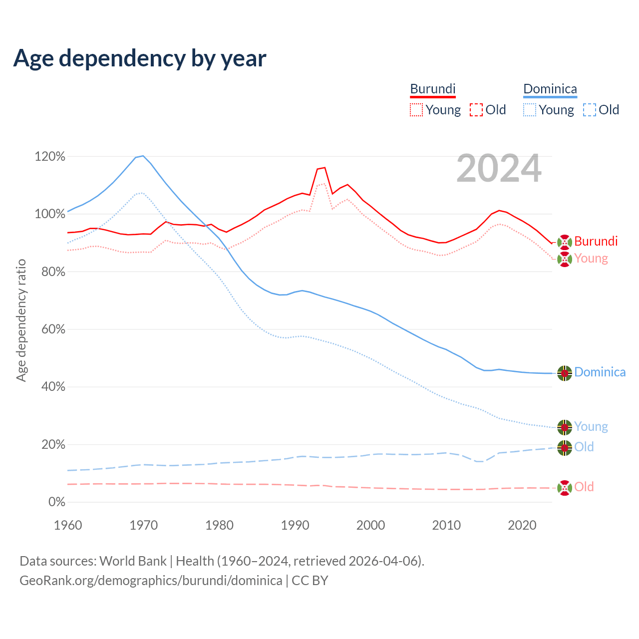 - Burundi is ranked 190/196 by median age (oldest to youngest) vs 66/196 for Dominica.