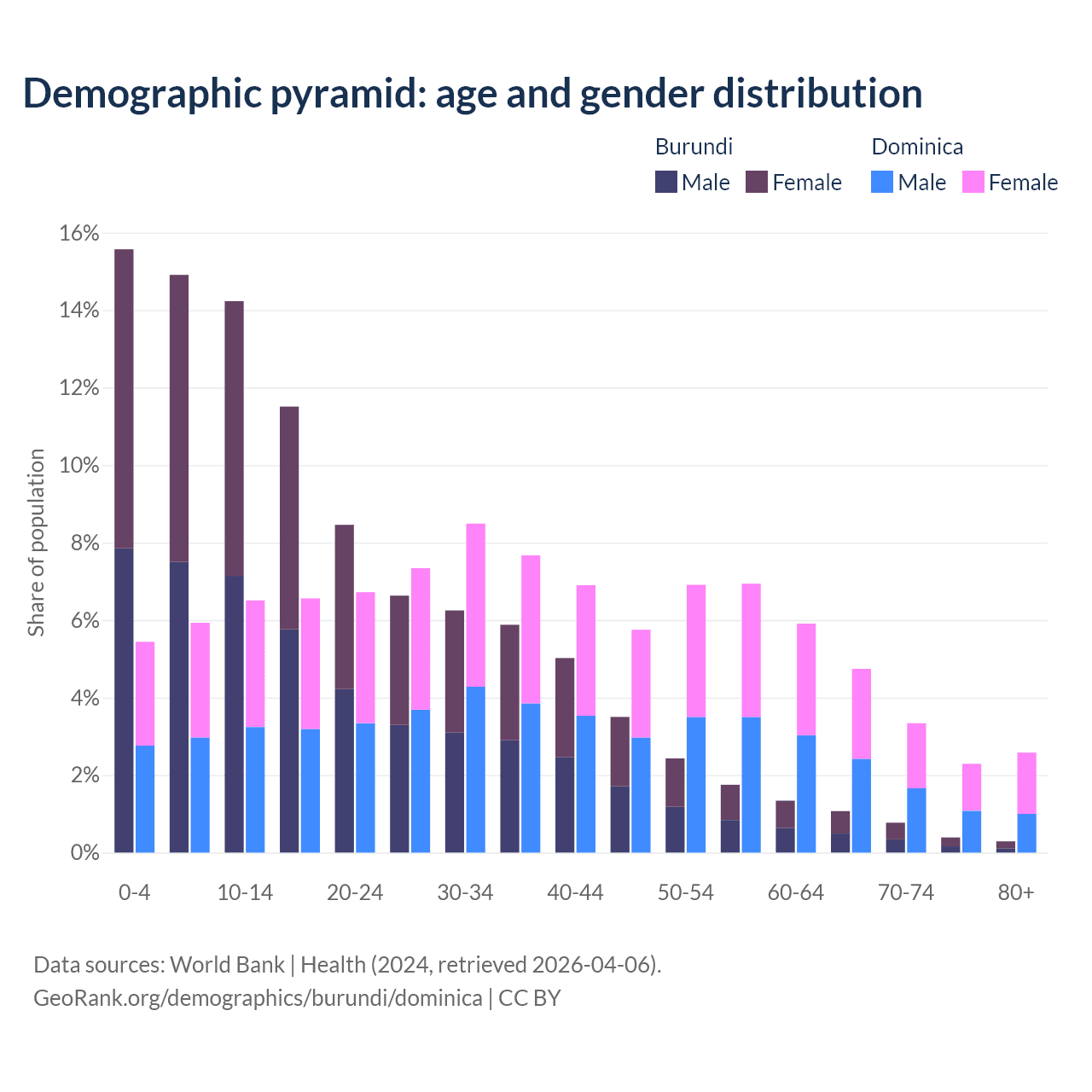 - The share of young demographic (0-15 years old) in Burundi is 44.7% vs 17.9% in Dominica.