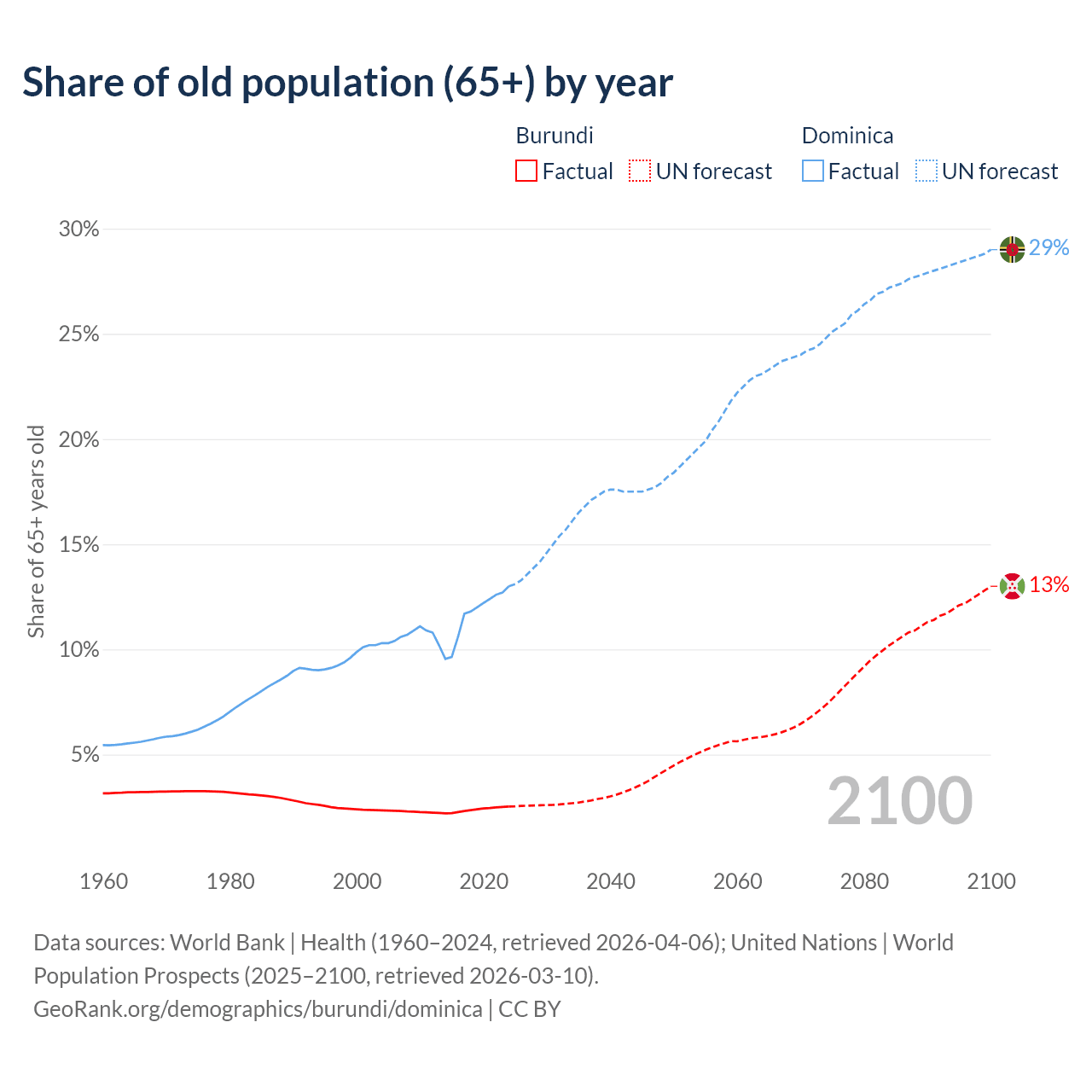 The share of older people aged 65 and over is 2.53% in Burundi and 13% in Dominica. Life expectancy in Burundi compared to Dominica .