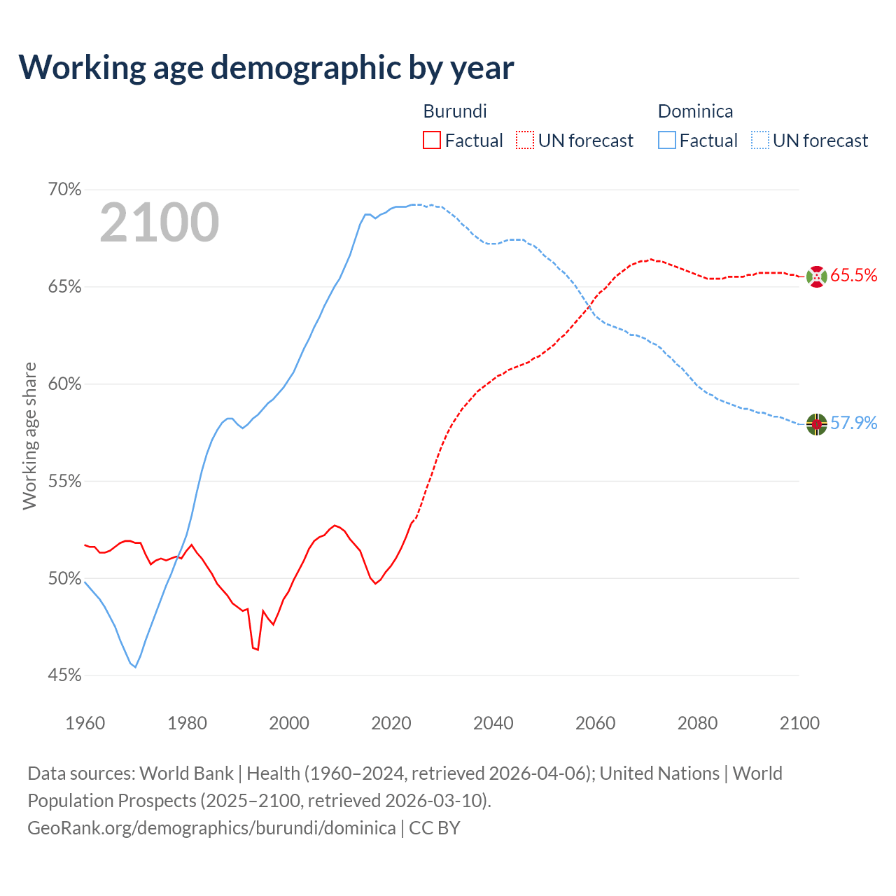 Median age Burundi vs Dominica, 1960-2100