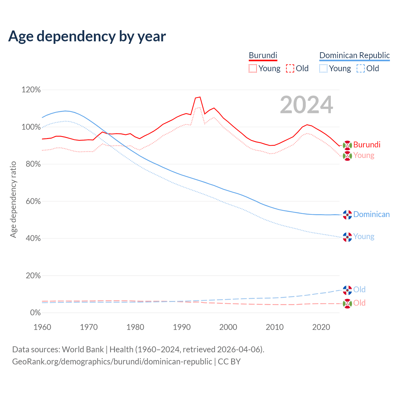 - Burundi is ranked 190/196 by median age (oldest to youngest) vs 112/196 for the Dominican Republic.