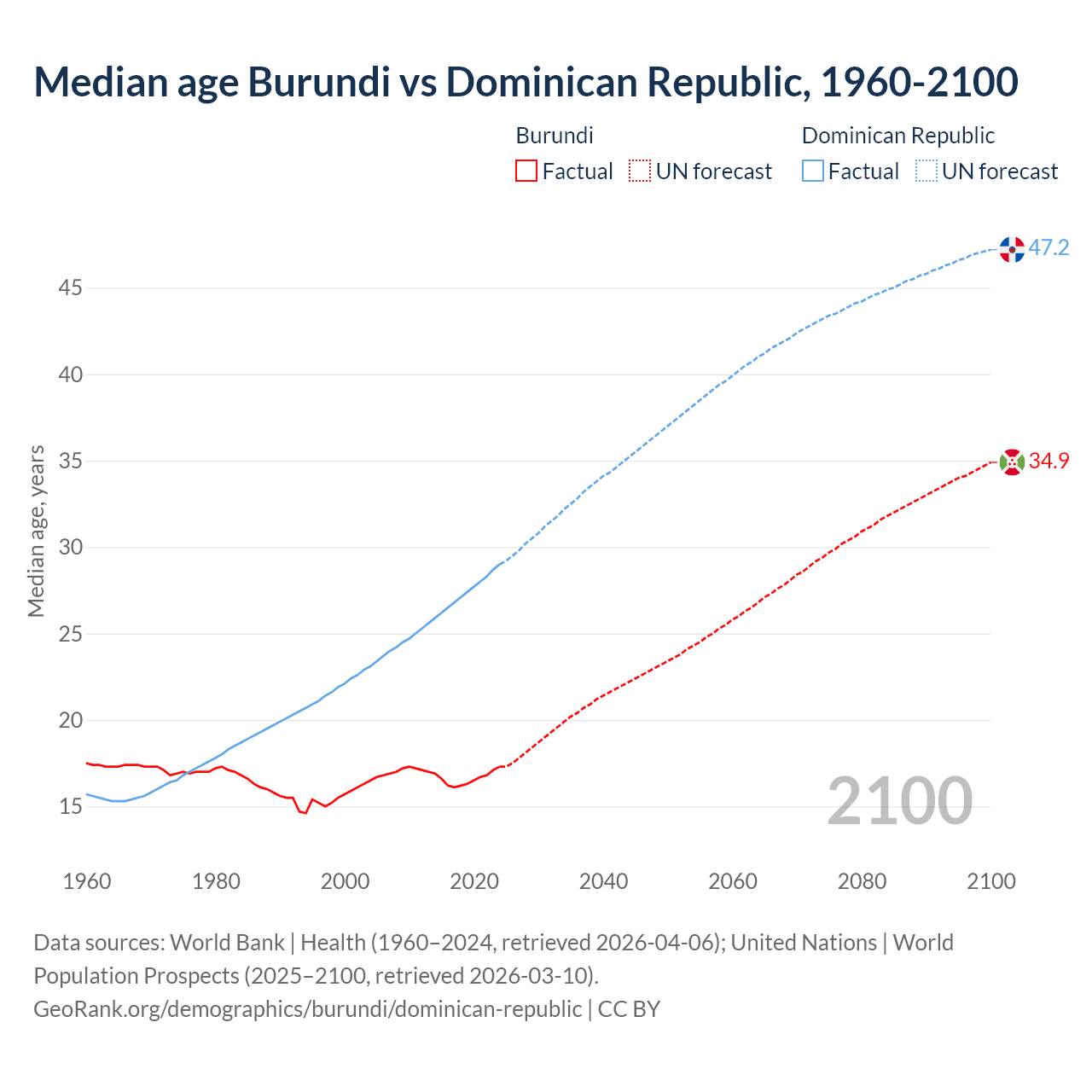 Median age Burundi vs Dominican Republic, 1960-2100
