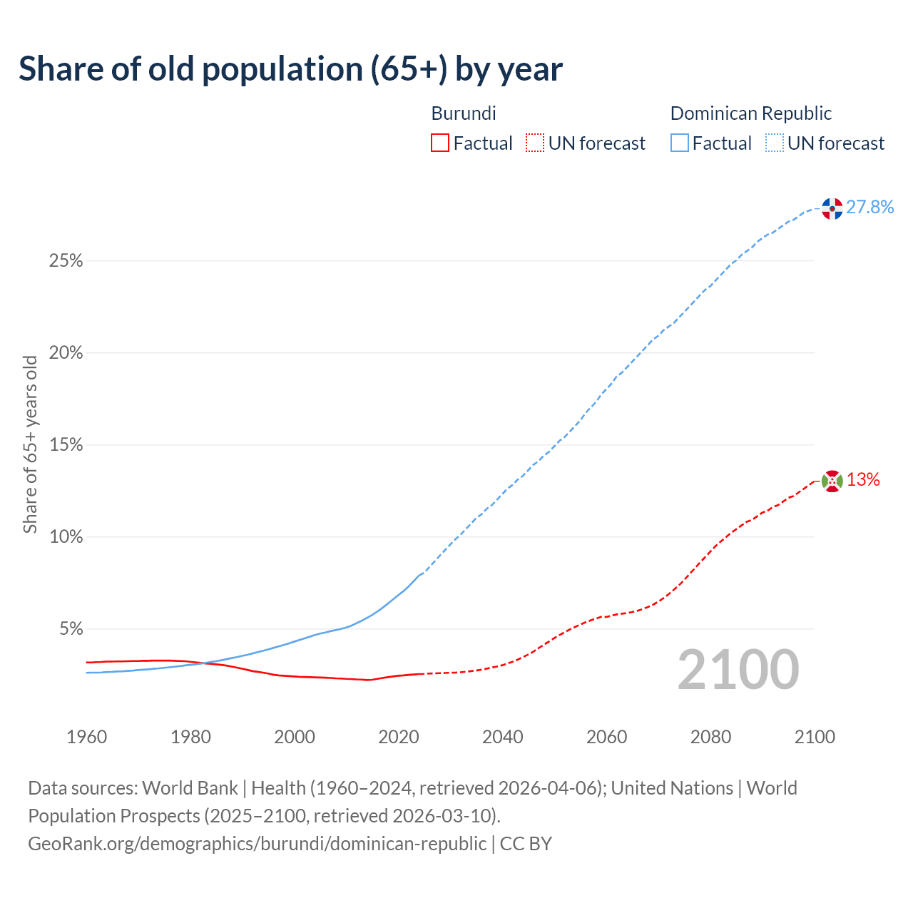 - The share of old-age demographic (65+) in Burundi is 2.53% vs 7.88% in the Dominican Republic.