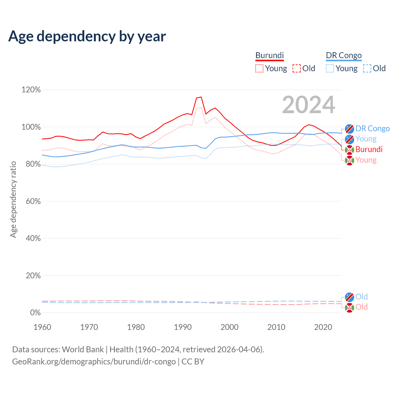 - Burundi is ranked 190/196 by median age (oldest to youngest) vs 191/196 for the DR Congo.