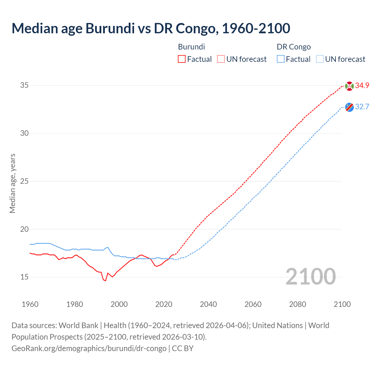 - The median age in Burundi is 17.3 years compared to 16.9 years in the DR Congo.