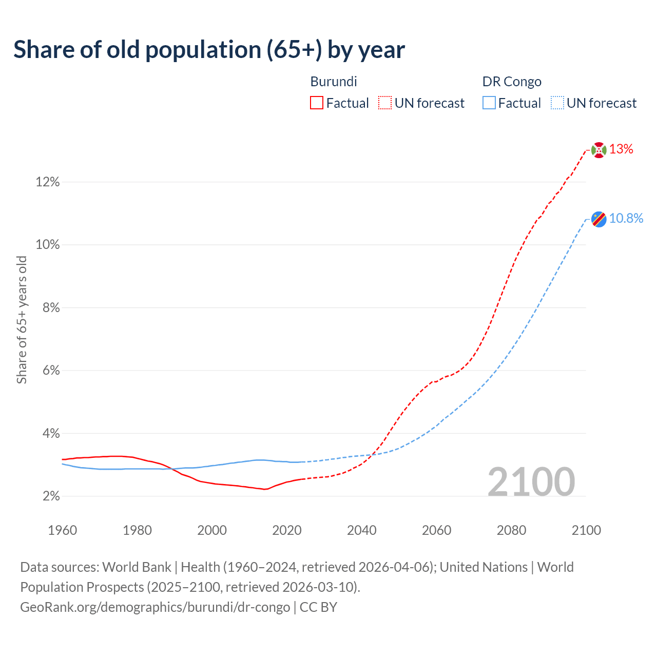 - The share of old-age demographic (65+) in Burundi is 2.53% vs 3.08% in the DR Congo.