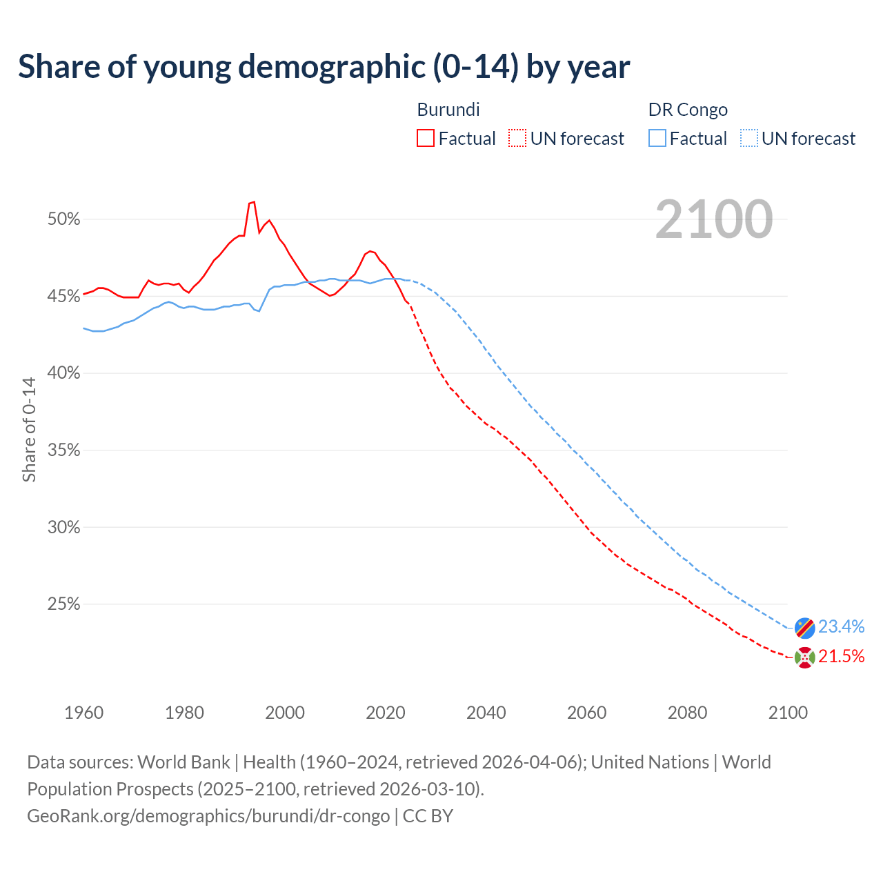 - The share of young demographic (0-15 years old) in Burundi is 44.7% vs 46% in the DR Congo.