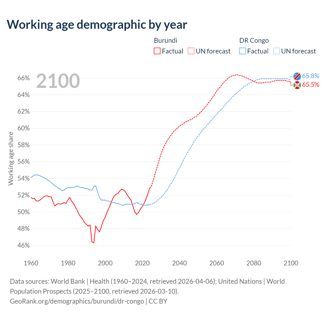 - Burundi has 7.83M working age adults (aged 15-64) vs 59.8M in the DR Congo.