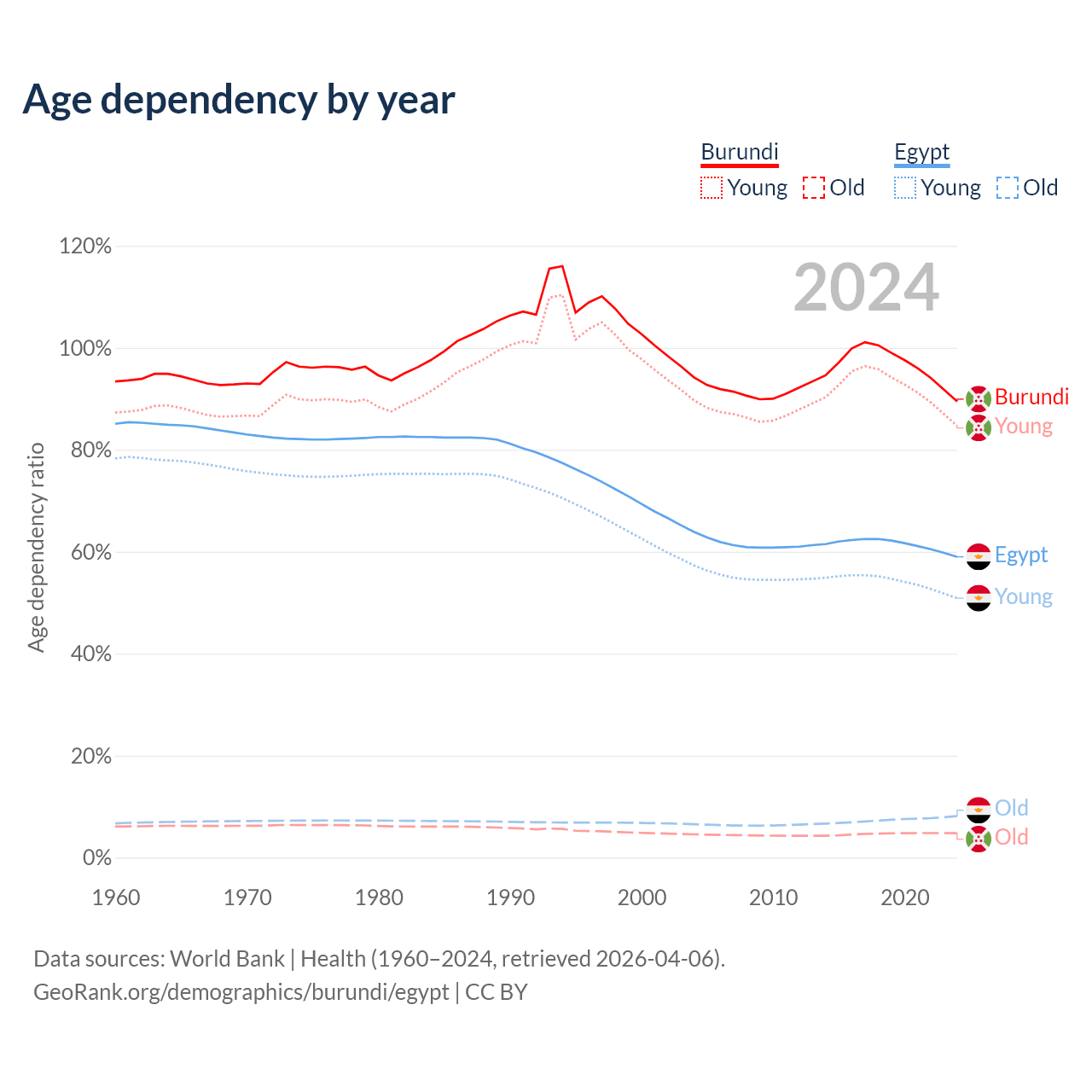 - Burundi is ranked 190/196 by median age (oldest to youngest) vs 133/196 for Egypt.