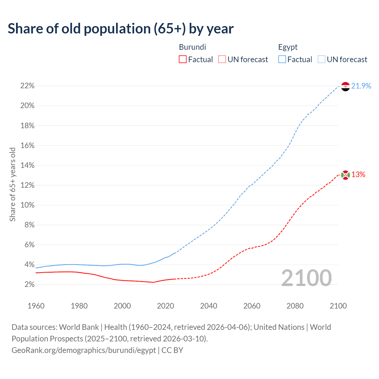 The share of older people aged 65 and over is 2.53% in Burundi and 5.12% in Egypt. Life expectancy in Burundi compared to Egypt .