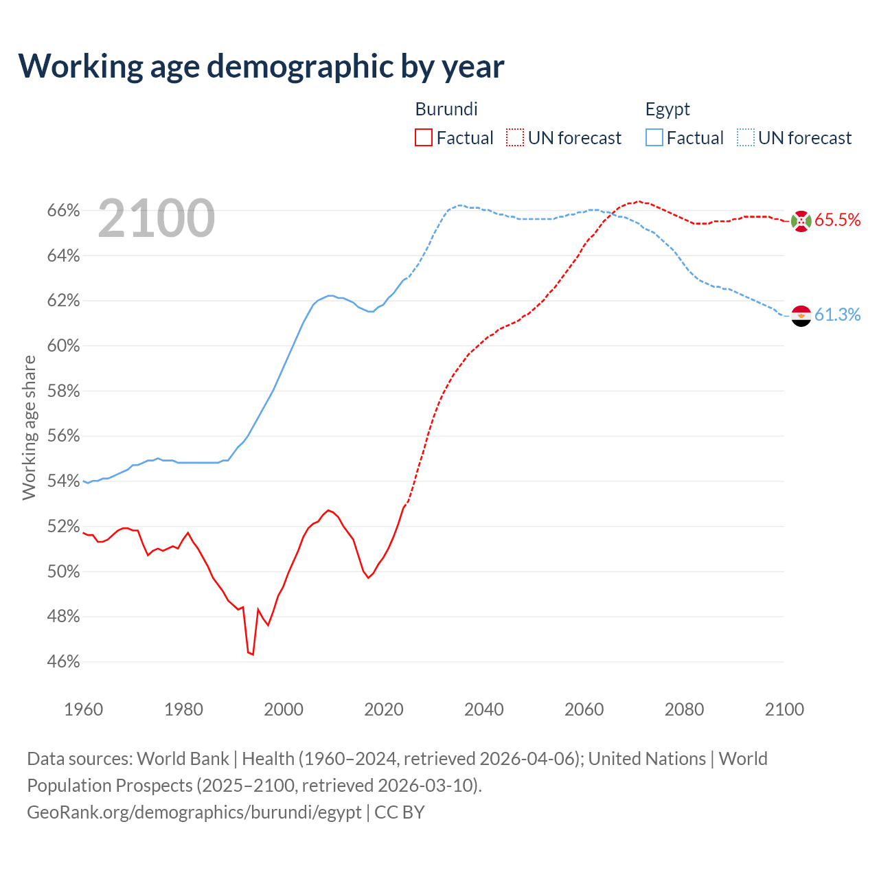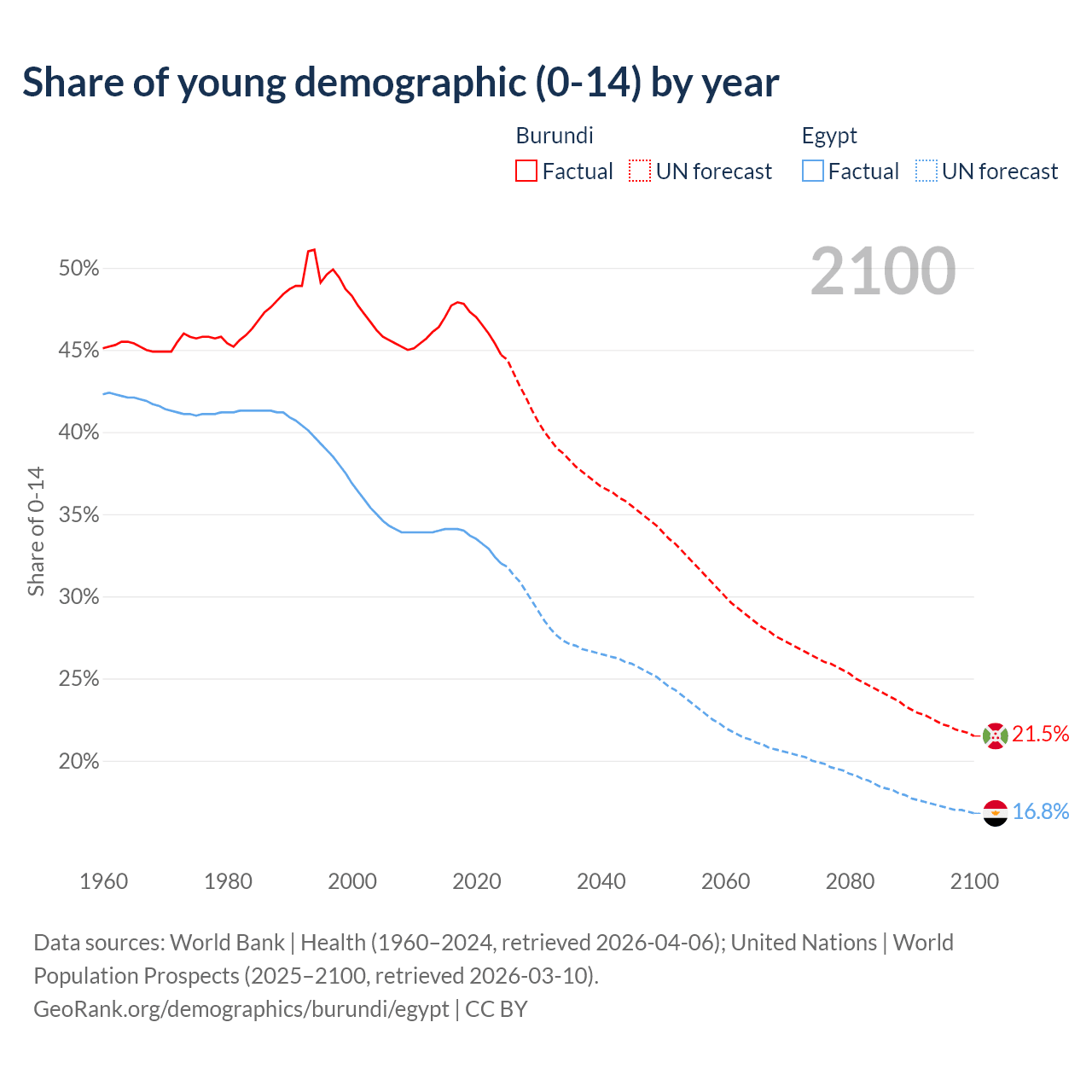 Median age Burundi vs Egypt, 1960-2100