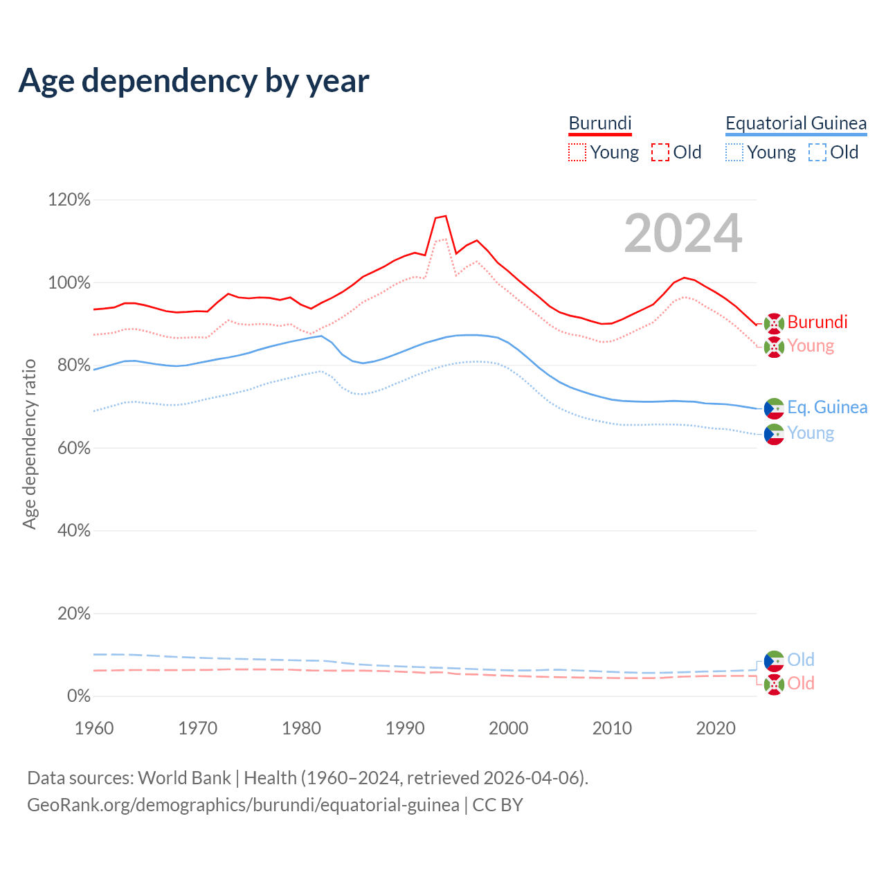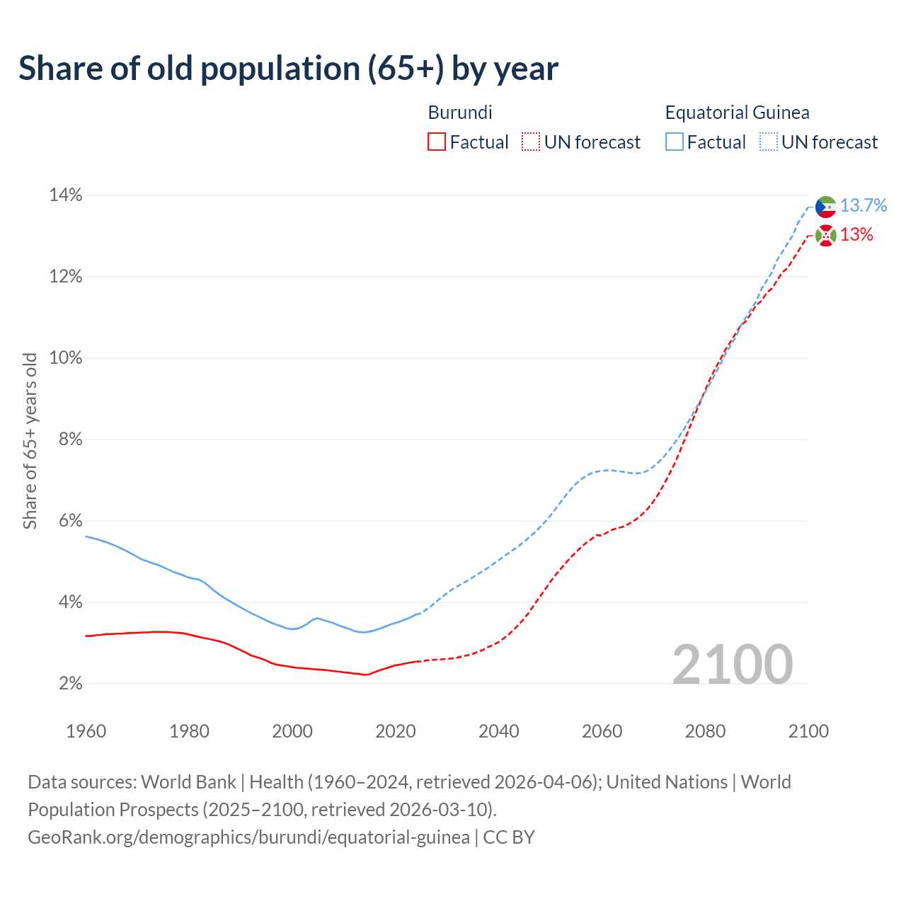 - The share of old-age demographic (65+) in Burundi is 2.53% vs 3.69% in Equatorial Guinea.