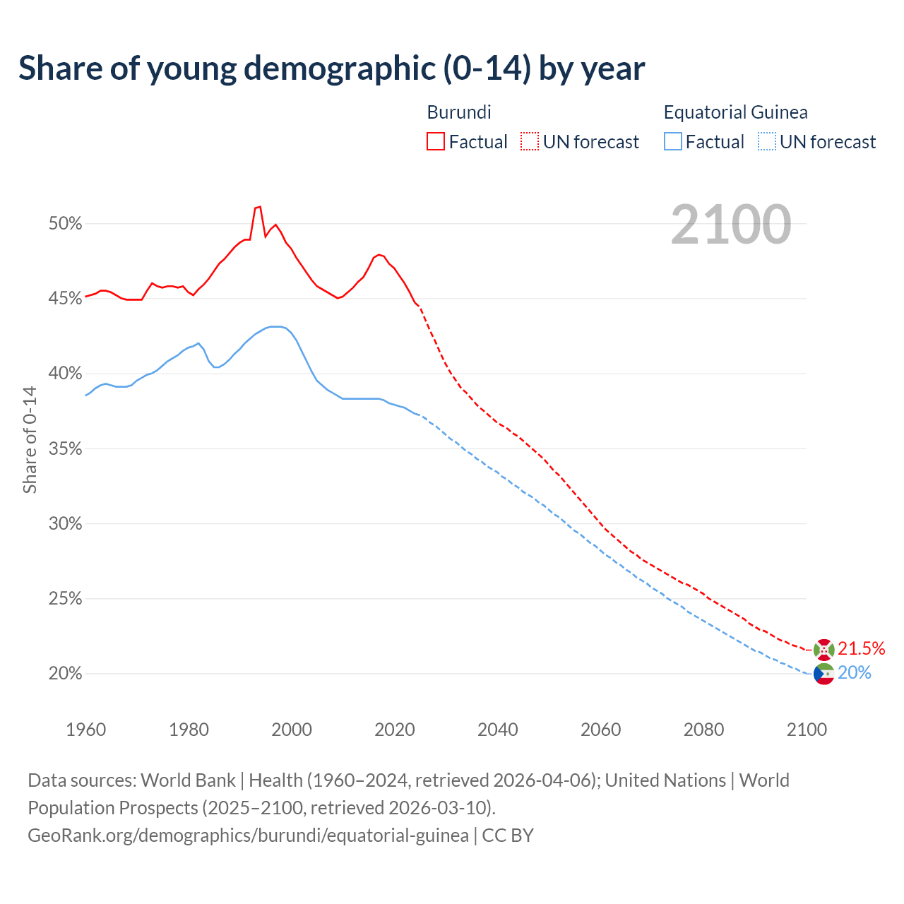 Median age Burundi vs Equatorial Guinea, 1960-2100