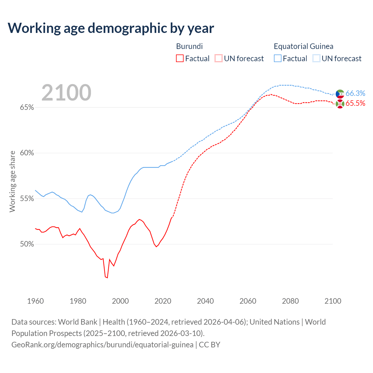 The share of older people aged 65 and over is 2.53% in Burundi and 3.69% in Equatorial Guinea. Life expectancy in Burundi compared to Equatorial Guinea .