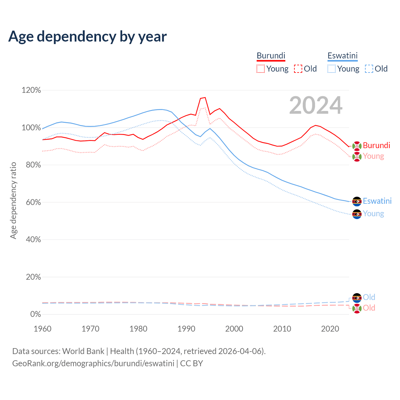 - Burundi is ranked 190/196 by median age (oldest to youngest) vs 141/196 for Eswatini.