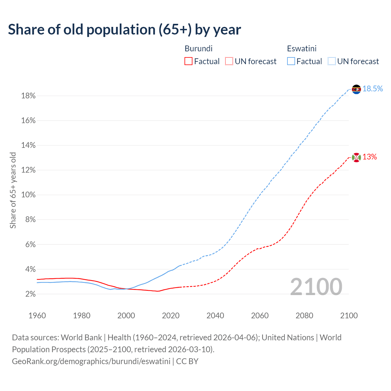 The share of older people aged 65 and over is 2.53% in Burundi and 4.26% in Eswatini. Life expectancy in Burundi compared to Eswatini .