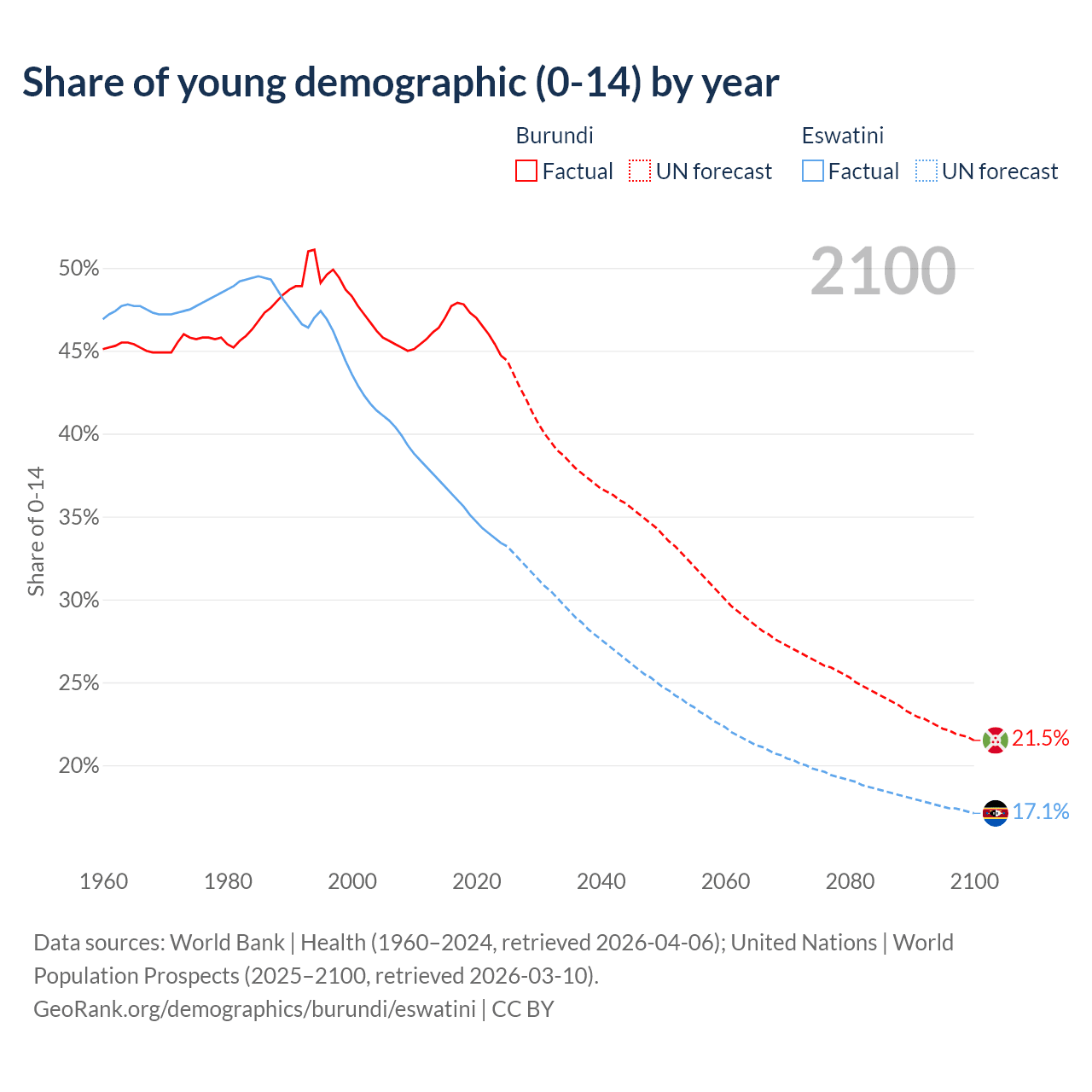 - The share of young demographic (0-15 years old) in Burundi is 44.7% vs 33.4% in Eswatini.