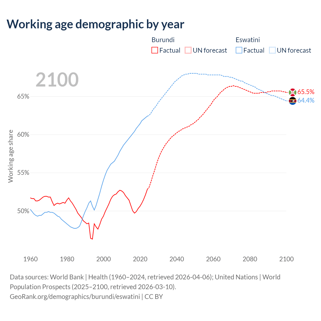 - Burundi has 7.83M working age adults (aged 15-64) vs 794K in Eswatini.