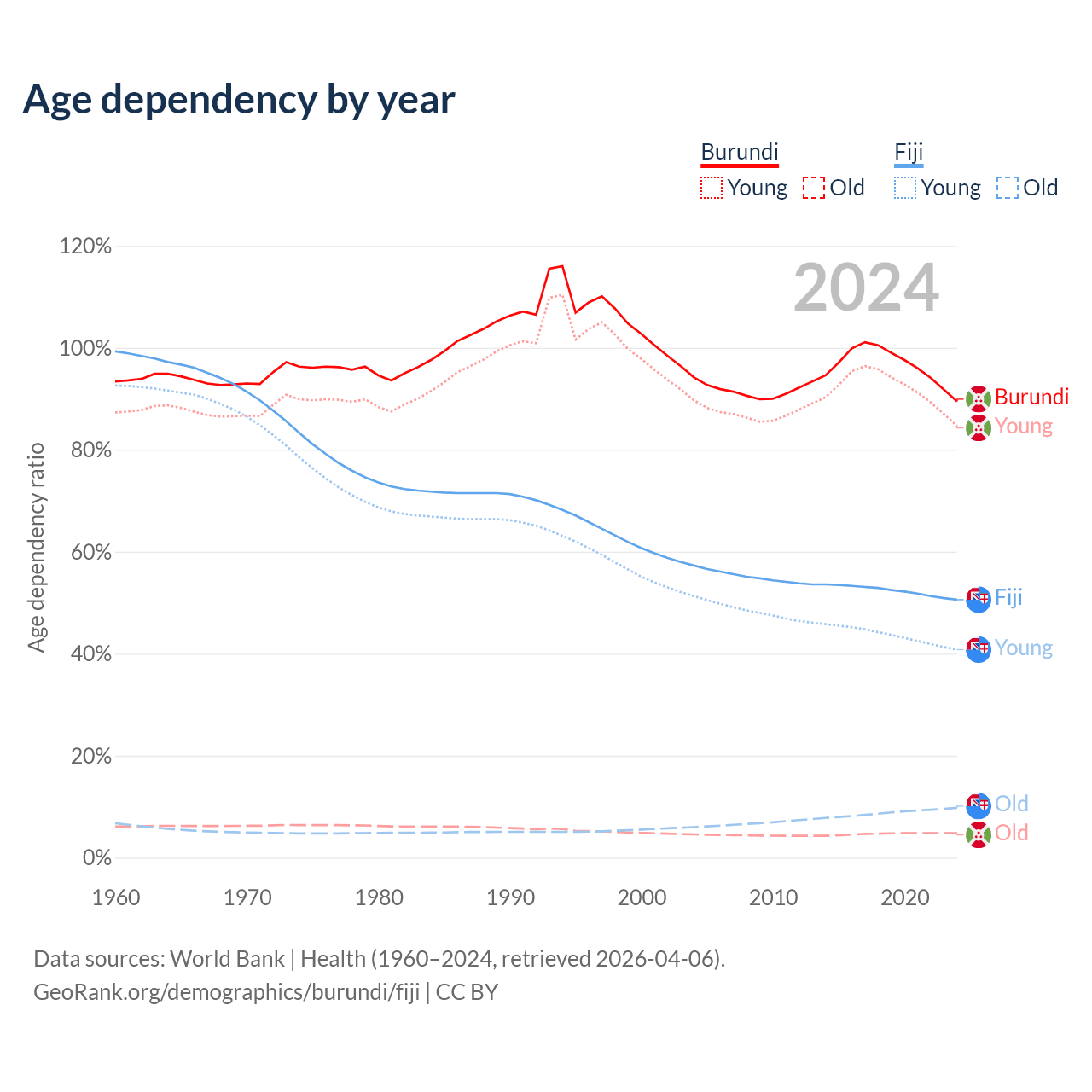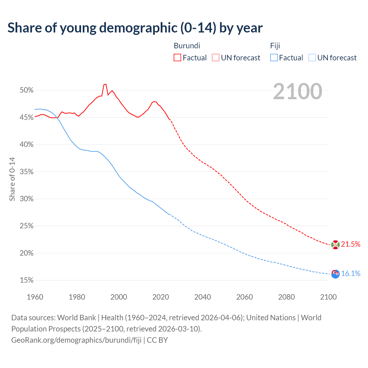- The share of young demographic (0-15 years old) in Burundi is 44.7% vs 27.1% in Fiji.