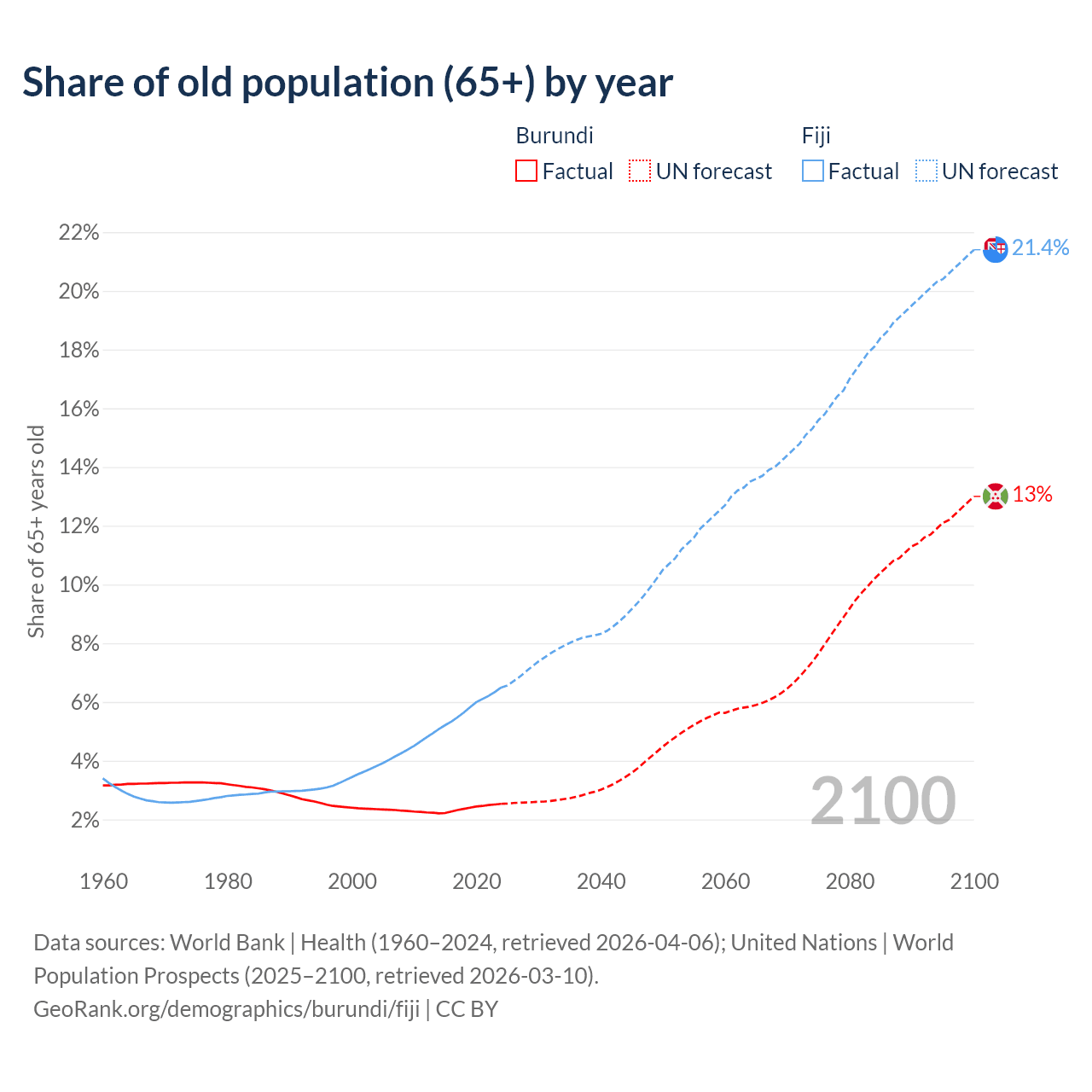 - The share of old-age demographic (65+) in Burundi is 2.53% vs 6.49% in Fiji.