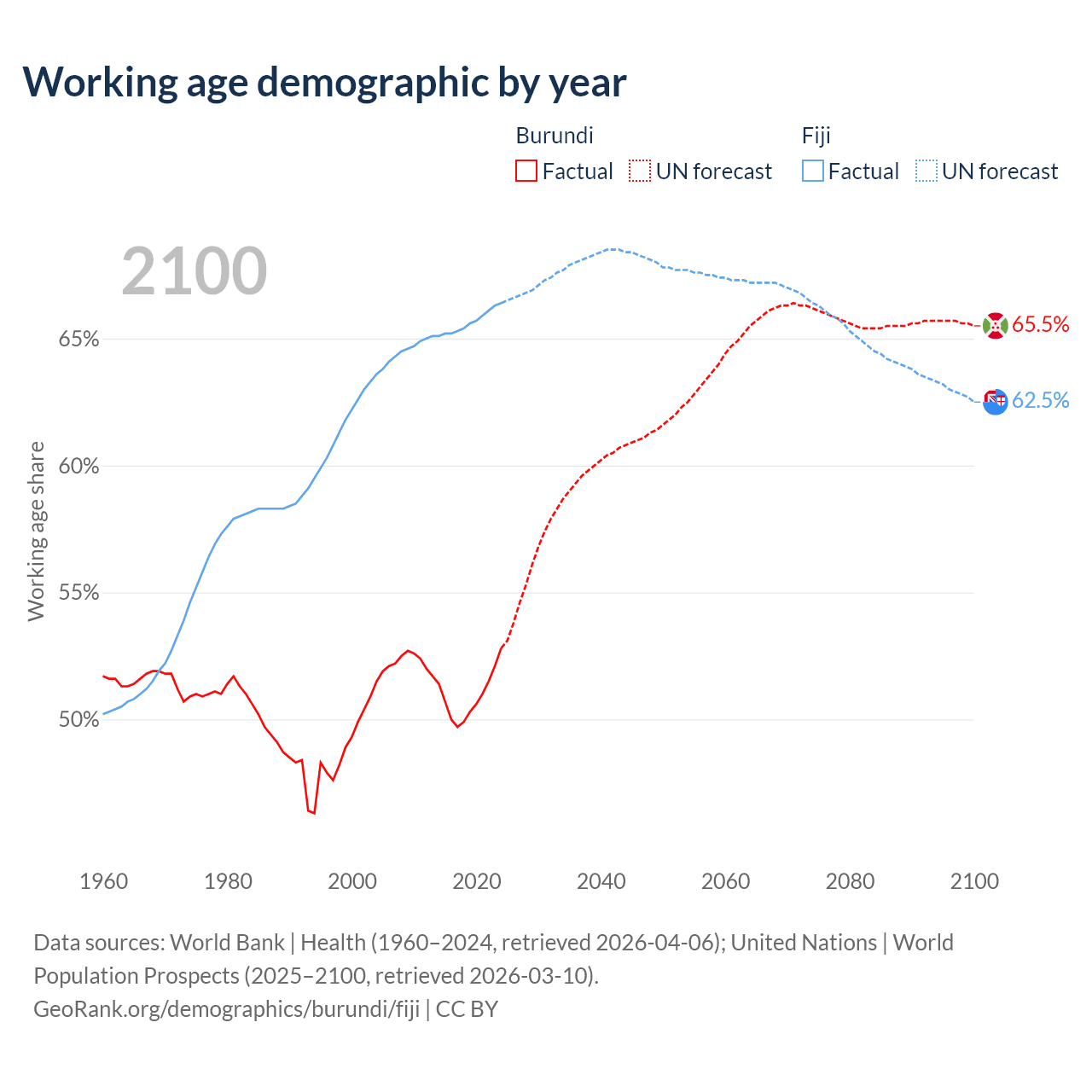 Median age Burundi vs Fiji, 1960-2100