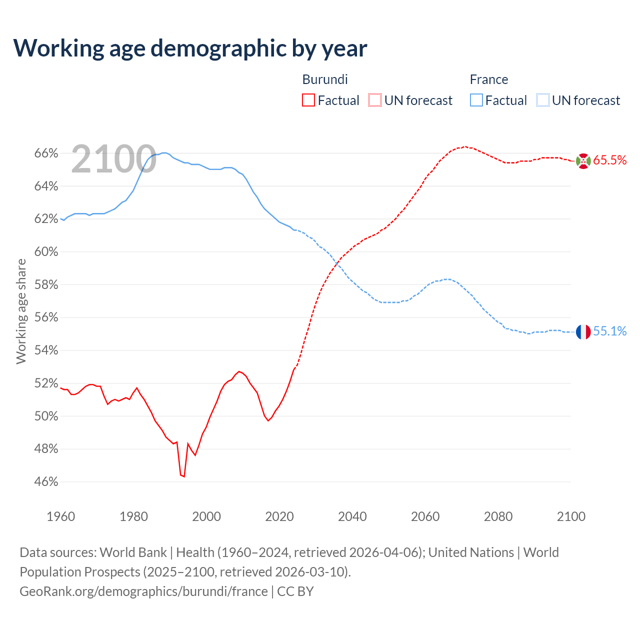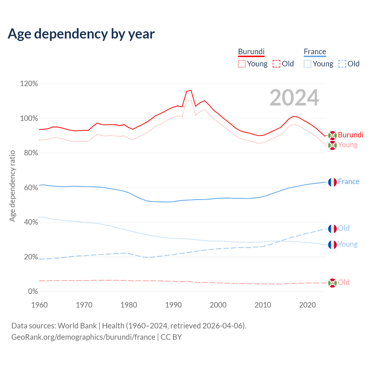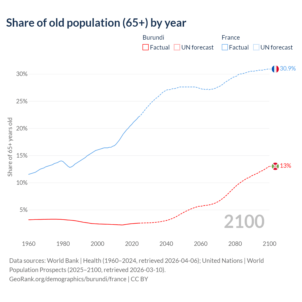 - The share of old-age demographic (65+) in Burundi is 2.53% vs 22.1% in France.