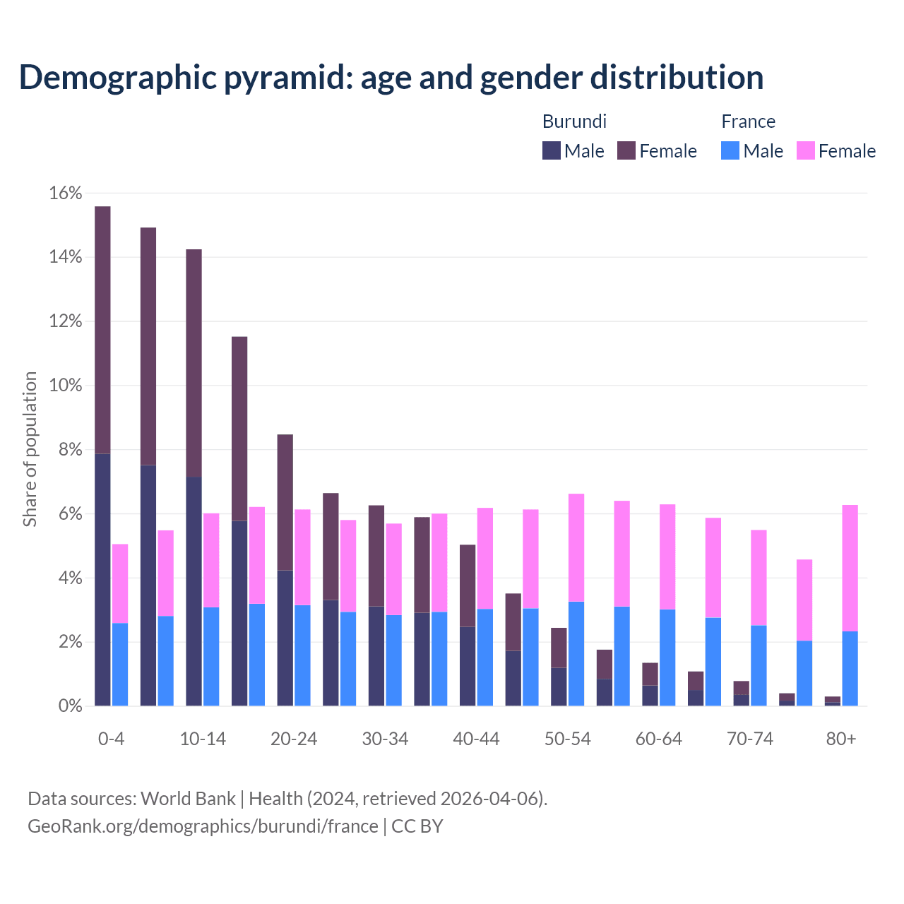 - Burundi is ranked 190/196 by median age (oldest to youngest) vs 29/196 for France.