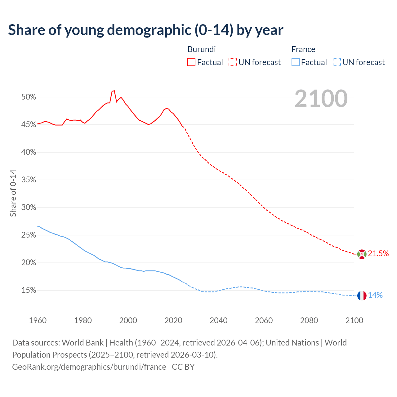- The share of young demographic (0-15 years old) in Burundi is 44.7% vs 16.5% in France.