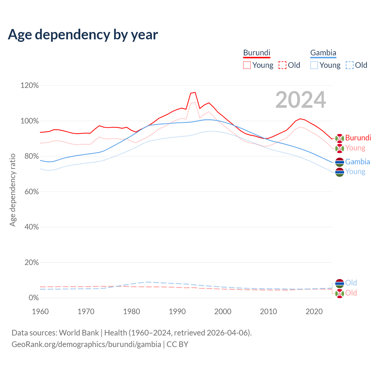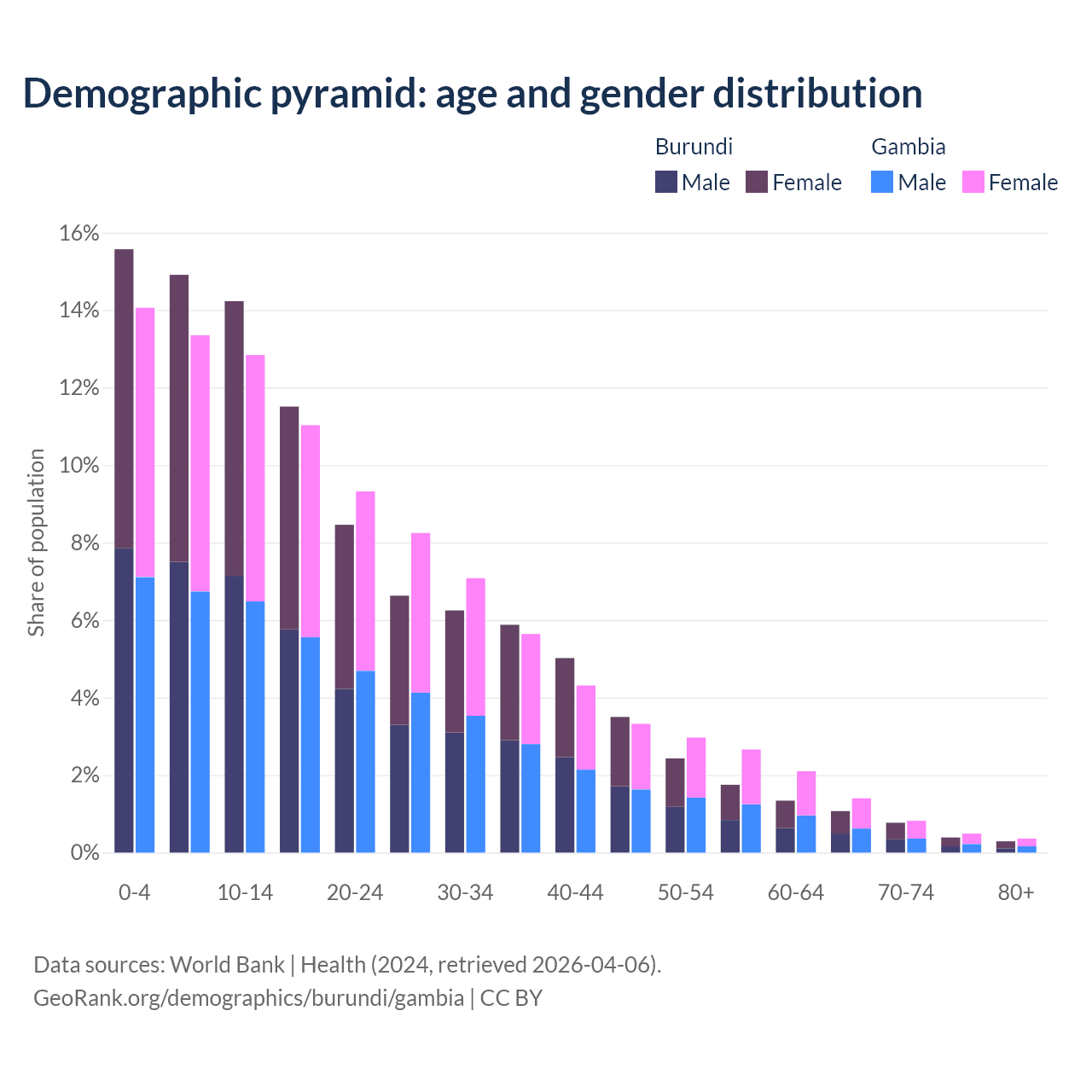 - Burundi is ranked 190/196 by median age (oldest to youngest) vs 171/196 for the Gambia.