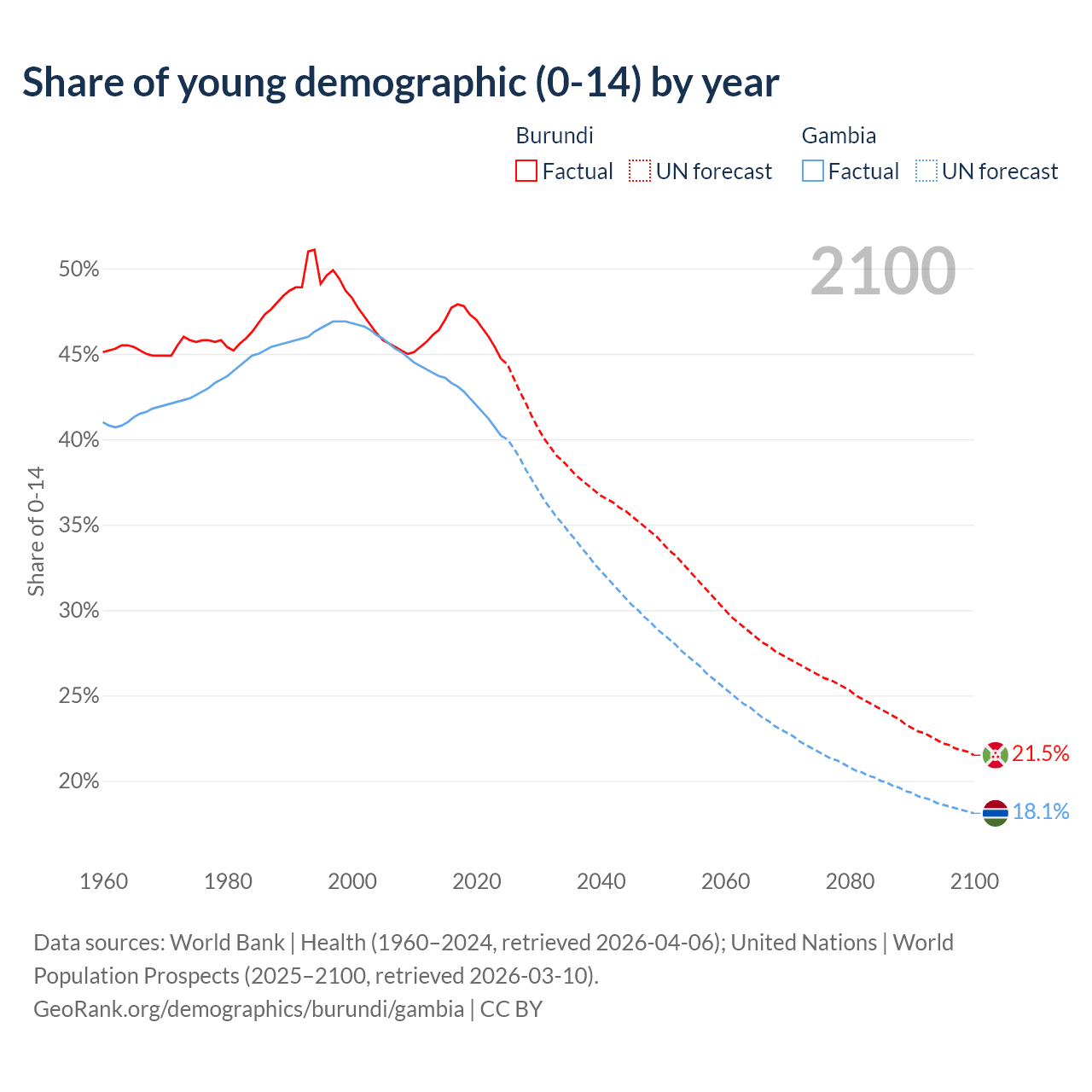 - The share of young demographic (0-15 years old) in Burundi is 44.7% vs 40.2% in the Gambia.