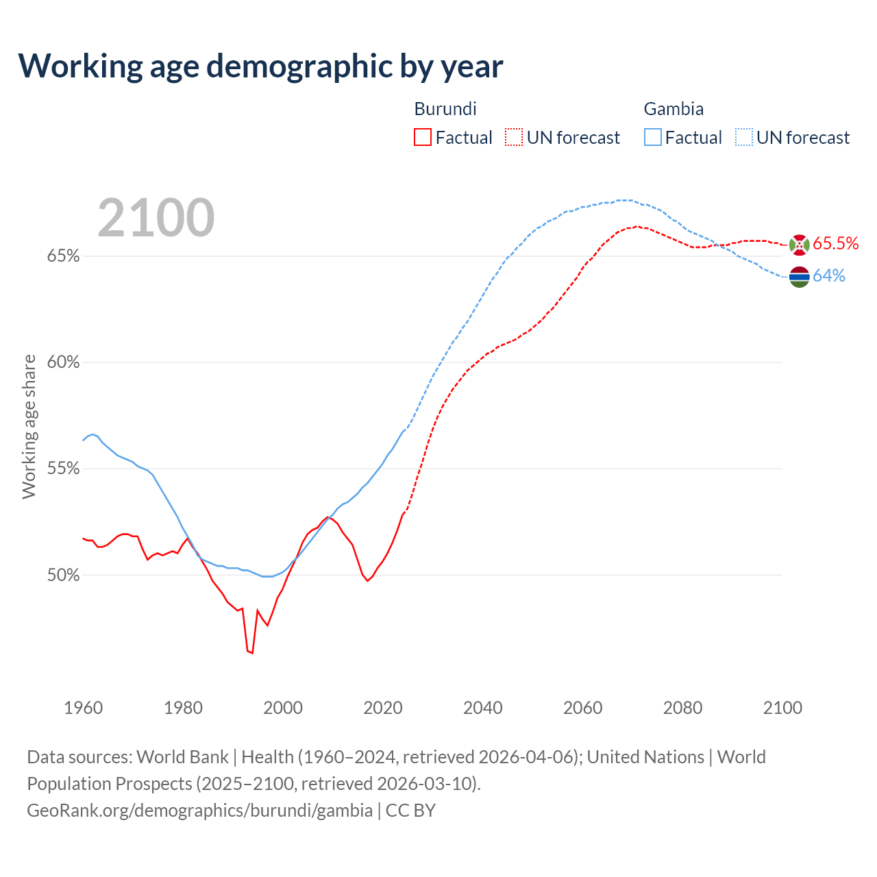 - Burundi has 7.83M working age adults (aged 15-64) vs 1.64M in the Gambia.
