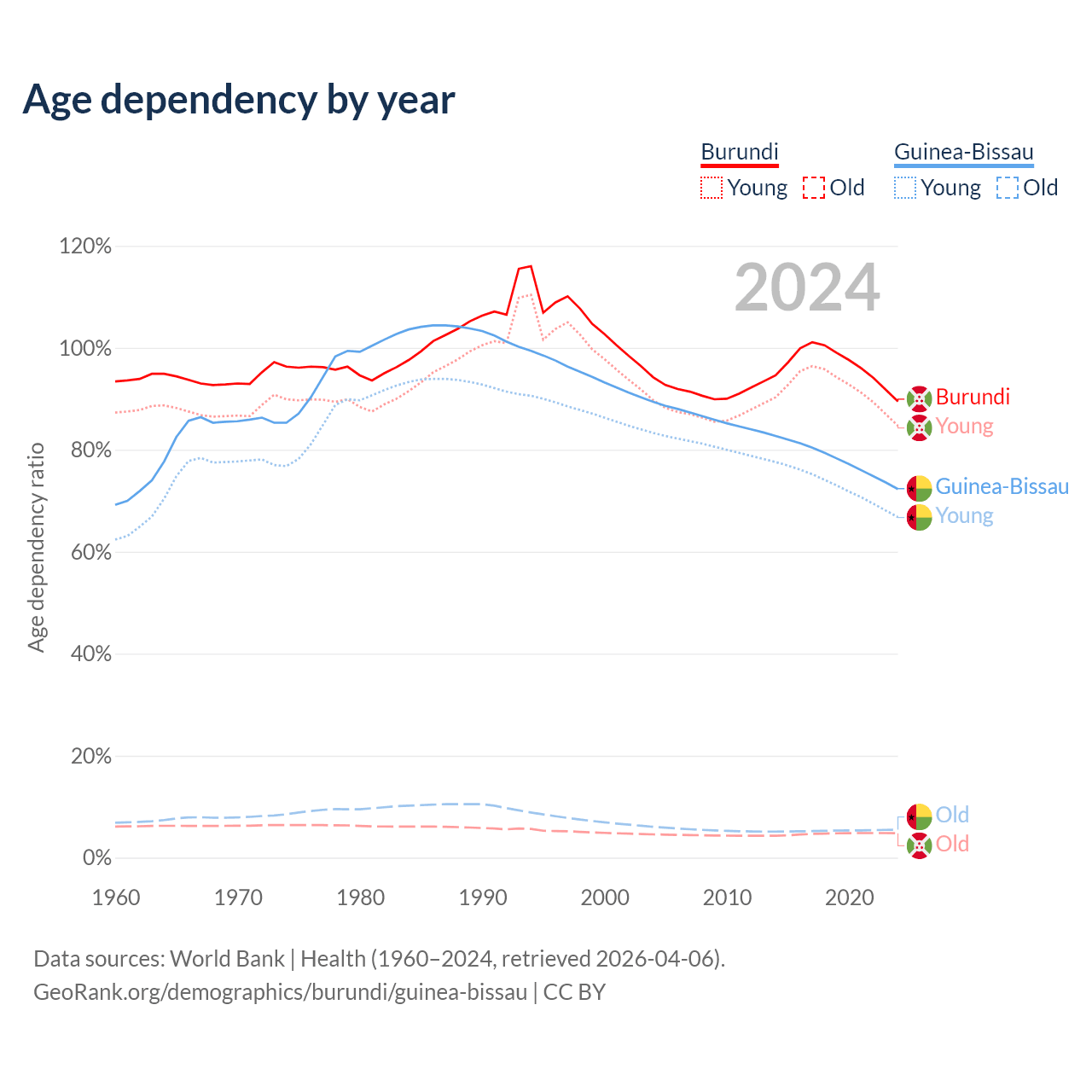 - Burundi is ranked 190/196 by median age (oldest to youngest) vs 164/196 for Guinea-Bissau.