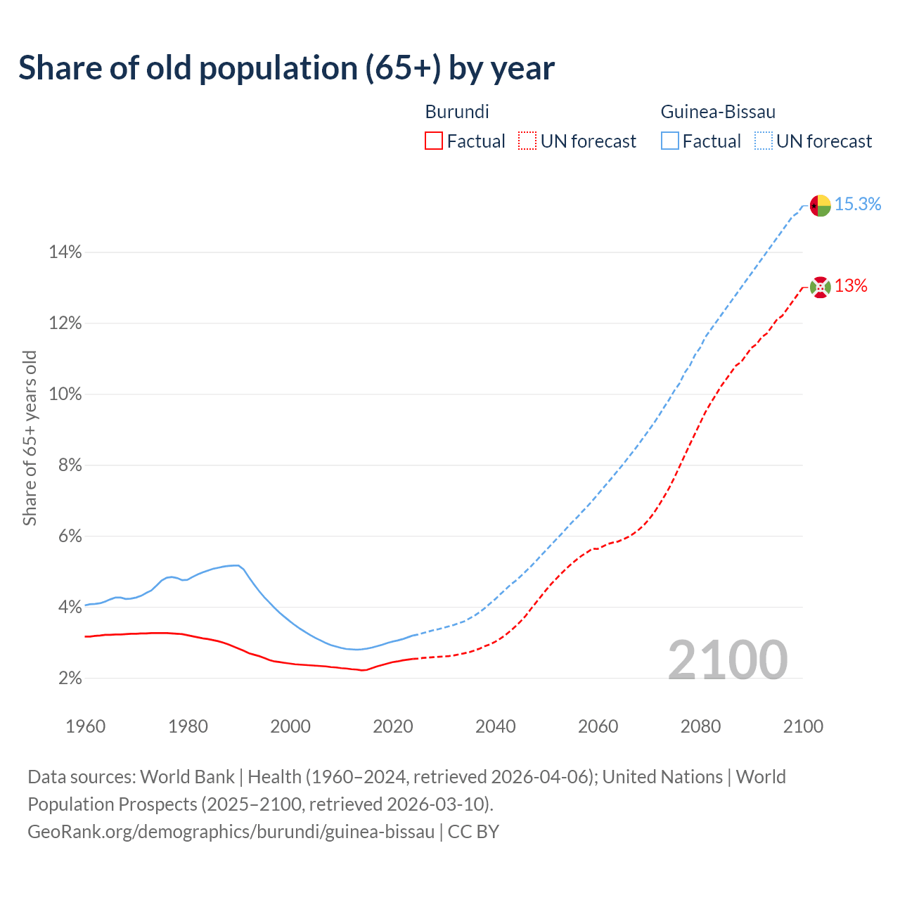 - The share of old-age demographic (65+) in Burundi is 2.53% vs 3.19% in Guinea-Bissau.