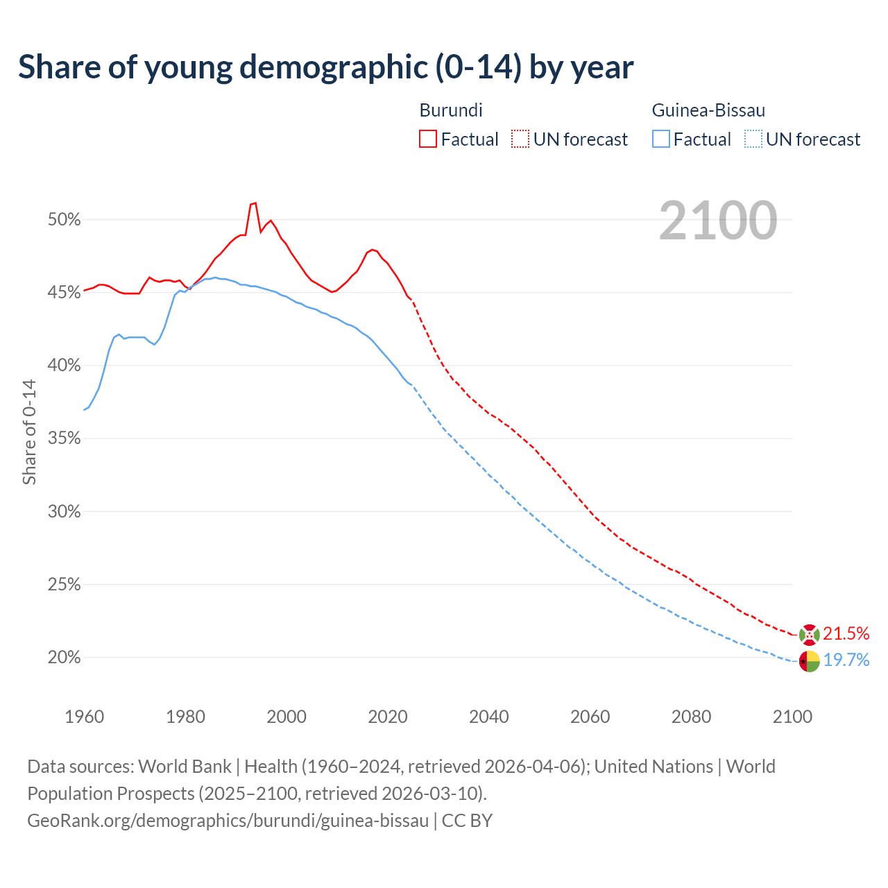 - The share of young demographic (0-15 years old) in Burundi is 44.7% vs 38.8% in Guinea-Bissau.