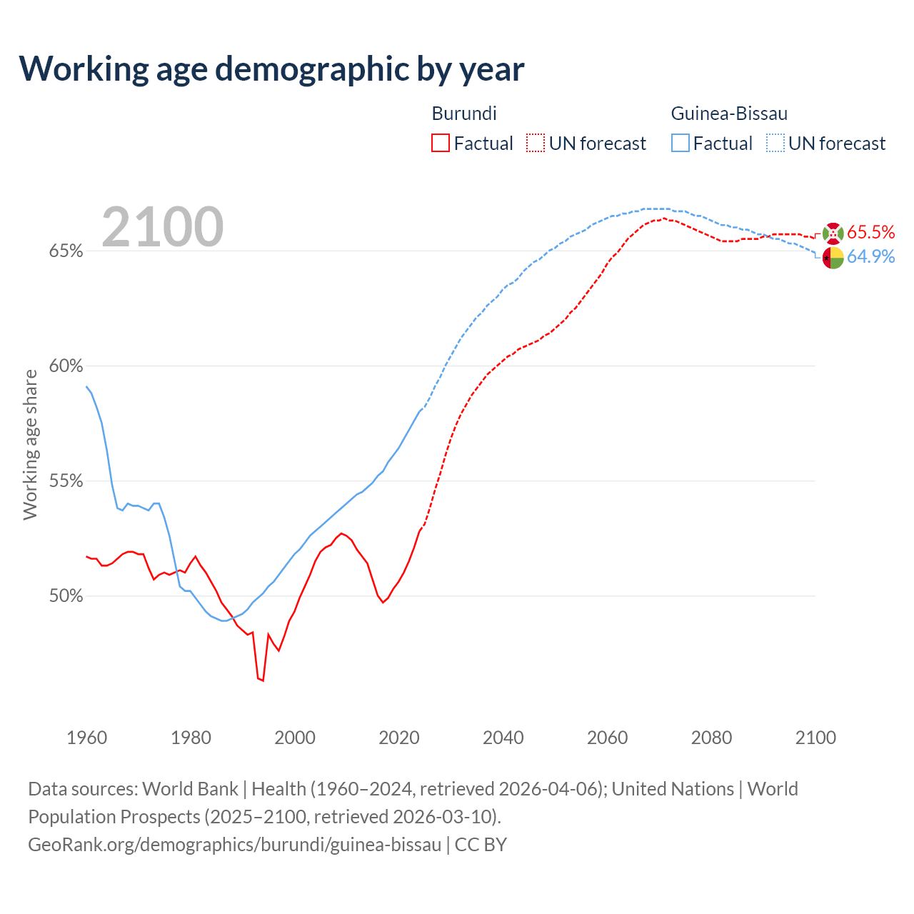 - Burundi has 7.83M working age adults (aged 15-64) vs 1.34M in Guinea-Bissau.